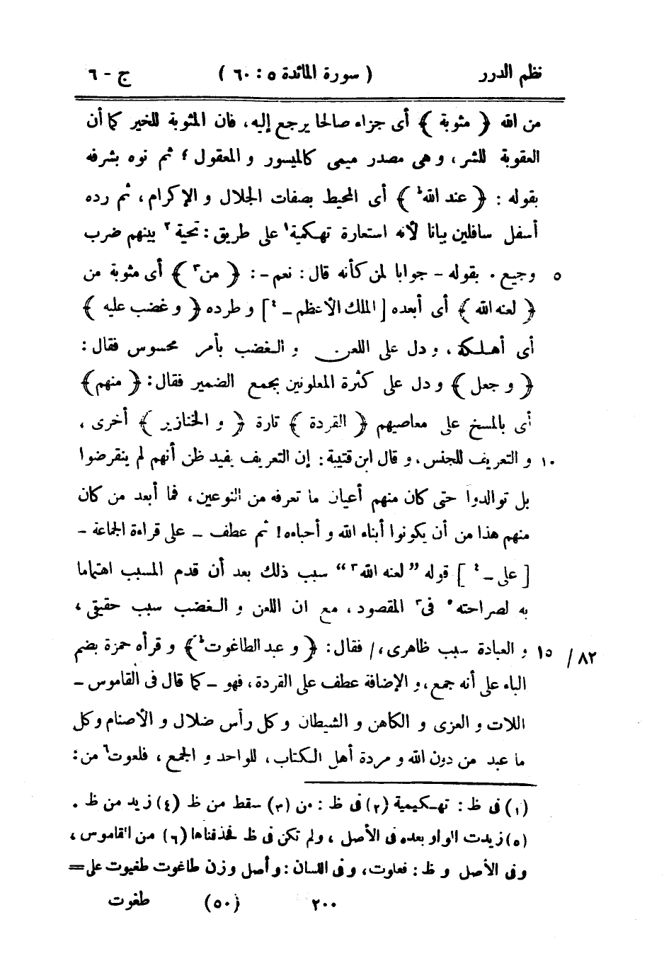 بقوله - جواباً لمن كأنه قال: نعم: {من} أي مثوبة من {لعنة الله} أي أبعده الملك الأعظم وطرده {وغضب عليه} أي أهلكه، ودل على اللعن والغضب بأمر محسوس فقال: {وجعل} ودل على كثرة الملعونين بجمع الضمير فقال: {منهم} أي بالمسخ على معاصيهم {القردة} تارة {والخنازير} أخرى، والتعريف للجنس، وقال ابن قتيبة: إن التعريف يفيد ظن أنهم لم ينقرضوا بل توالدوا حتى كان منهم أعيان ما تعرفه من النوعين، فما أبعد من كان منهم هذا من أن يكونوا أبناء الله وأحباءه! ثم عطف - على قراءة الجماعة - على قوله {لعنه الله} سبب ذلك بعد أن قدم المسبب اهتماماً به لصراحته في المقصود، مع أن اللعن والغضب سبب حقيقي، والعبادة سبب ظاهري، فقال: {وعبد الطاغوت} وقرأه حمزة بضم الباء على أنه جمع والإضافة عطف على القردة، فهو - كما قال في القاموس - اللات والعزى والكاهن والشيطان وكل رأس ضلال والأصنام وكل ما عبد من دون الله ومردة أهل الكتاب، للواحد والجمع، فلعوت من