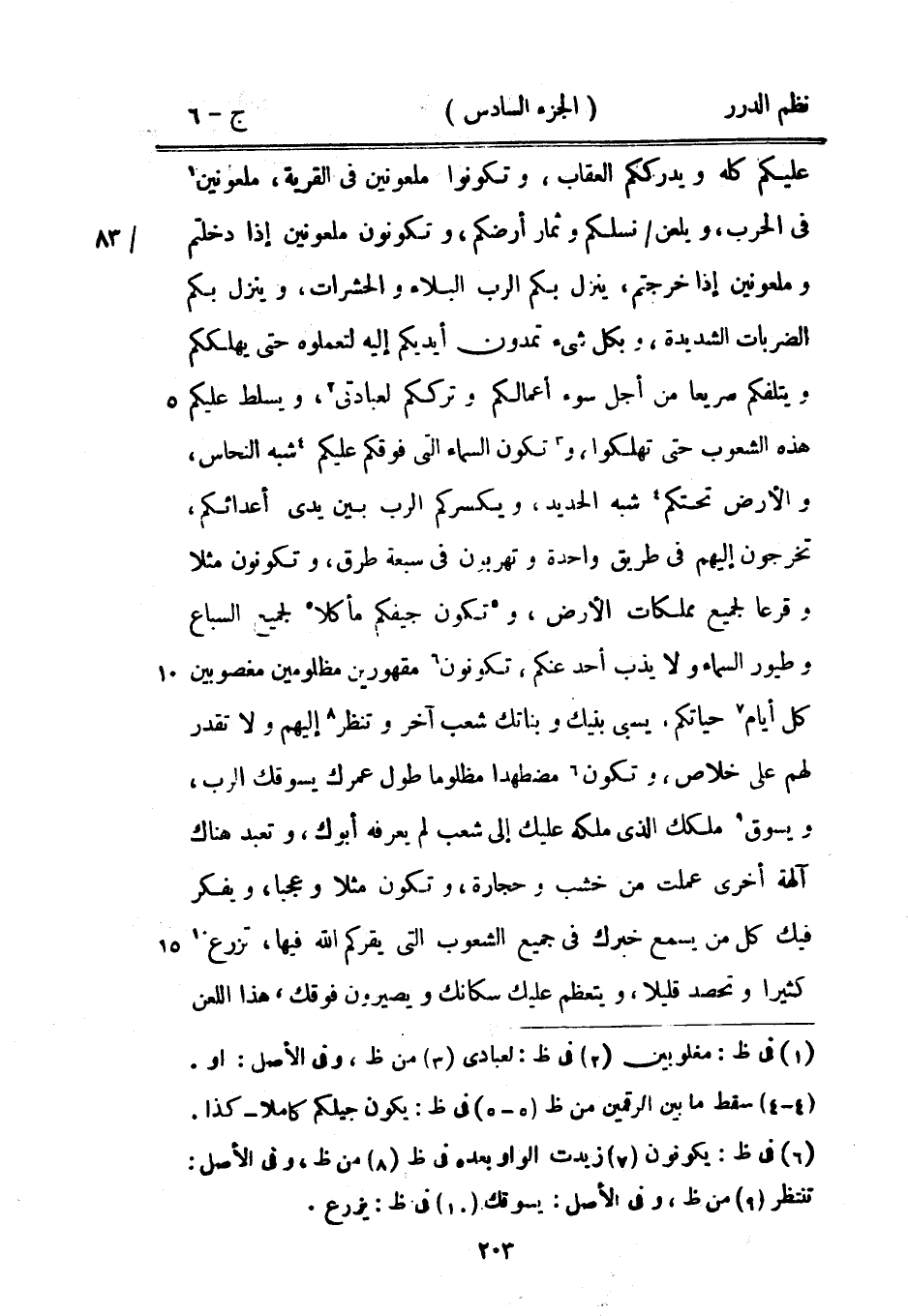 عليكم كله ويدرككم العقاب، وتكونوا ملعونين في القرية، ملعونين في الحرب، ويلعن نسلكم وثمار أرضكم، وتكونون ملعونين إذا دخلتم وملعونين إذا خرجتم، ينزل بكم الرب البلاء والحشرات، وينزل بكم الضربات الشديدة، وبكل شيء تمدون أيديكم إليه لتعملوه حتى يهلككم ويتلفكم سريعاً من أجل سوء أعمالكم وترككم لعبادتي، ويسلط عليكم هذه الشعوب حتى تهلكوا، وتكون السماء التي فوقكم عليكم شبه النحاس، والأرض تحتكم شبه الحديد، ويكسركم الرب بين يدي أعدائكم، تخرجون إليهم في طريق واحدة وتهربون في سبعة طرق، وتكونون مثلاً وقرعاً لجميع مملكات الأرض، وتكون جيفكم مأكلاً لجميع السباع وطيور السماء ولا يذب أحد عنكم، تكونون مقهورين مظلومين مغصوبين كل أيام حياتكم، يسبي بنيك وبناتك شعب آخر وتنظر إليهم ولا تقدر لهم على خلاص، وتكون مضطهداً مظوماً طور عمرك يسوقك الرب، ويسوق ملكك الذي مكله عليك إلى شعب لم يعرفه أبوك، وتعبد هناك آلهة أخرى عملت من خشب وحجارة، وتكون مثلاً وعجباً ويفكر فيك كل من يسمع خبرك في جميع الشعوب التي يقركم الله فيها، تزرع كثيراً وتحصد قليلاً، ويتعظم عليك سكانك ويصيرون فوقك، هذا اللعن