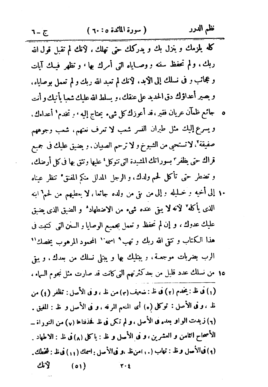 كله يلزمك وينزل بك ويدركك حتى تهلك، لأنك لم تقبل قول الله ربك، ولم تحفظ سننه ووصاياه التي أمرك بها، وتظهر فيك آيات وعجائب وفي نسلك إلى الأبد، لأنك لم تعبد الله ربك ولم تعمل بوصاياه، ويصير أعداؤك دق الحديد على عنقك، ويسلط الله عليك شعباً يأتيك وأنت جائع ظمآن عريان فقير، قد أعوزك كل شيء يحتاج إليه، وتخدم أعداءك، ويسرع إليك مثل طيران النسر شعب لا تعرف نعتهم، شعب وجوههم صفيقة، لا تستحيي من الشيوخ ولا ترحم الصبيان، ويضيق عليك في جميع قراك حتى يظفر بسوراتك المشيدة التي تتوكل عليها وتثق بها في كل أرضك، وتضطر حتى تأكل لحم ولدك، والرجل المدلل منكم المفنق تنظر عيناه إلى أخيه وخليله وإلى من بقي من ولده جائعاً، لا يعطيهم من لحم ابنه الذي يأكله لأنه لا يبقى عنده شيء من الاضطهاد والضيق الذي يضيق عليك عدوك، وإن لم تحفظ وتعمل بجميع الوصايا والسنن التي كتبت في هذا الكتاب وتتقي الله ربك وتهب اسمه المحمود المرهوب يخصك الرب بضربات موجعة، ويبتليك بها ويبتلي نسلك من بعدك، ويبقى من نسلك عدد قليل من بعد كثرتهم التي كانت قد صارت مثل نجوم السماء،