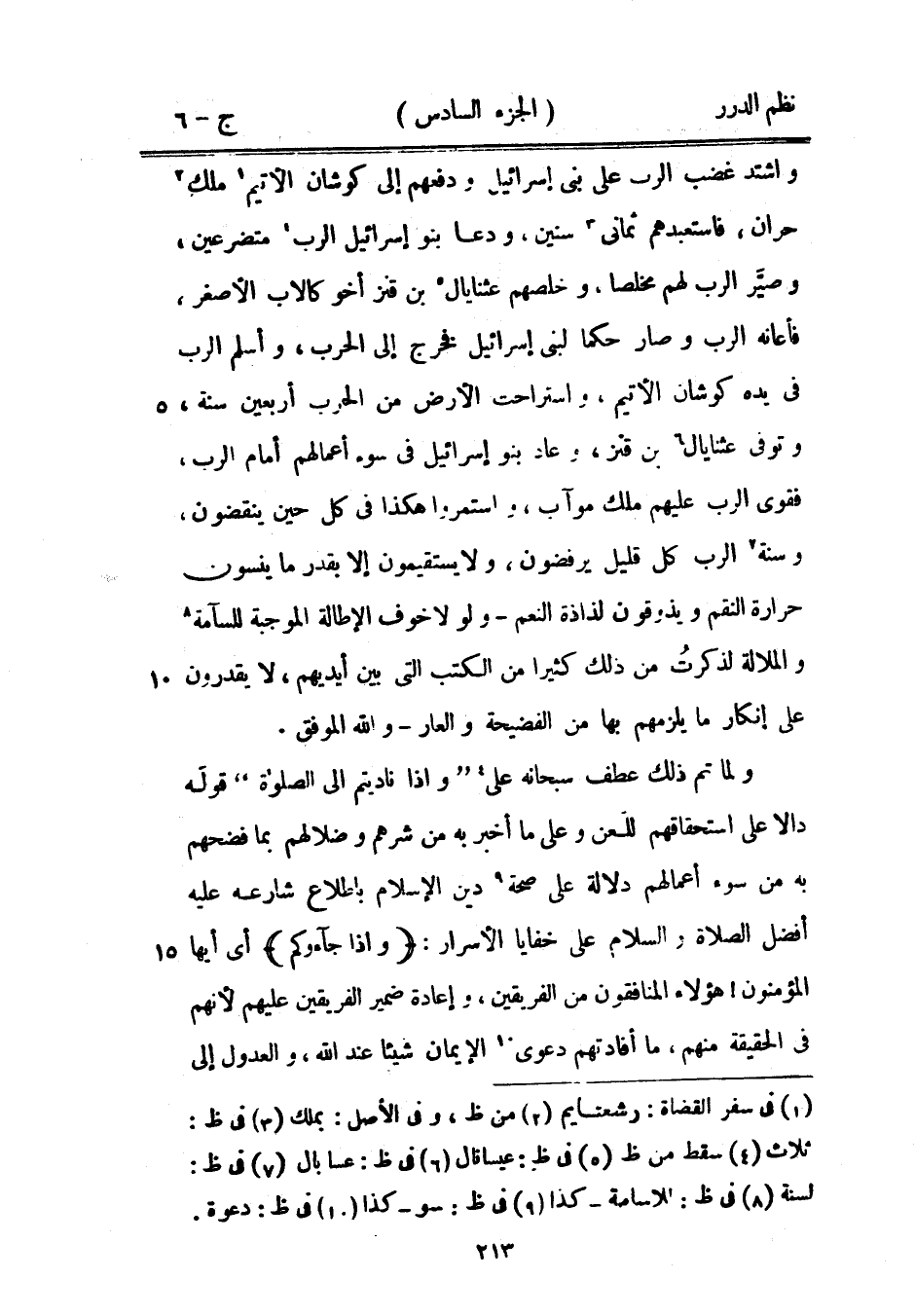 واشتد غضب الرب على بني إسرائيل ودفعهم إلى كوشان الأتيم ملك حران، فاستعبدهم ثماني سنين، ودعا بنو إسرائيل الرب متضرعين، وصيَّر الرب لهم مخلصاً، وخلصهم عثنايال بن قنز أخو كالاب الأصغر، فأعانه الرب وصار حكماً لبني إسرائيل فخرج إلى الحرب، وأسلم الرب في يده كوشان الأتيم، واستراحت الأرض من الحرب أربعين سنة، وتوفي عثنايال ابن قنز، وعاد بنو إسرائيل في سوء أعمالهم أمام الرب فقوى الرب عليهم ملك موآب، واستمروا هكذا في كل حين ينقضون، وسنة الرب كل قليل يرفضون، ولا يستقيمون إلا بقدر ما ينسون حرارة النقم ويذوقون لذاذة النعم - ولولا خوف الإطالة الموجبة للسآمة والملالة لذكرت من ذلك كثيراً من الكتب التي بين أيديهم، لا يقدرون على إنكار ما يلزمهم بها من الفضيحة والعار - والله الموفق.