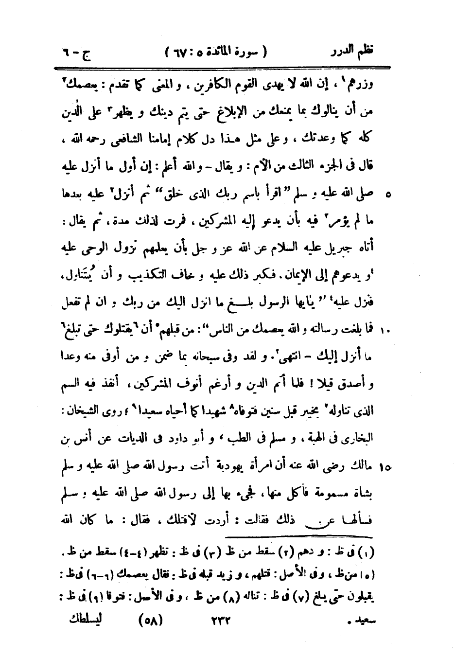 {اقرأ باسم ربك الذي خلق} [العلق: 1] ثم أنزل عليه بعدها ما لم يؤمر فيه بأن يدعو إليه المشركين، فمرت لذلك مدة، ثم يقال: أتاه جبريل عليه السلام عن الله عز وجل بأن يعلمهم نزول الوحي عليه ويدعوهم إلى الإيمان. فكبر ذلك عليه وخاف التكذيب وأن يُتَناول، فنزل عليه {يا أيها الرسول بلغ ما أنزل إليك من ربك وإن لم تفعل فما بلغت رسالتك والله يعصمك من الناس} [المائدة: 67] : من قبلهم أن يقتلوك حتى تبلغ ما أنزل إليك - انتهى. ولقد وفى سبحانه بما ضمن ومن أوفى منه وعداً وأصدق قيلاً! فلما أتم الدين وأرغم أنوف المشركين، أنفذ فيه السم الذي تناوله بخيبر قبل سنين فتوفاه شهيداً كما أحياه سعيداً؛ روى الشيخان: البخاري في الهبة، ومسلم في الطب، وأبو داود في الديات عن أنس بن مالك رضي الله عنه «أن امرأة يهودية أتت رسول الله صَلَّى اللهُ عَلَيْهِ وَسَلَّمَ بشاة مسمومة فأكل منها، فجيء بها إلى رسول الله صَلَّى اللهُ عَلَيْهِ وَسَلَّمَ فسألها عن ذلك فقالت: أردت لأقتلك، فقال: ما كان الله