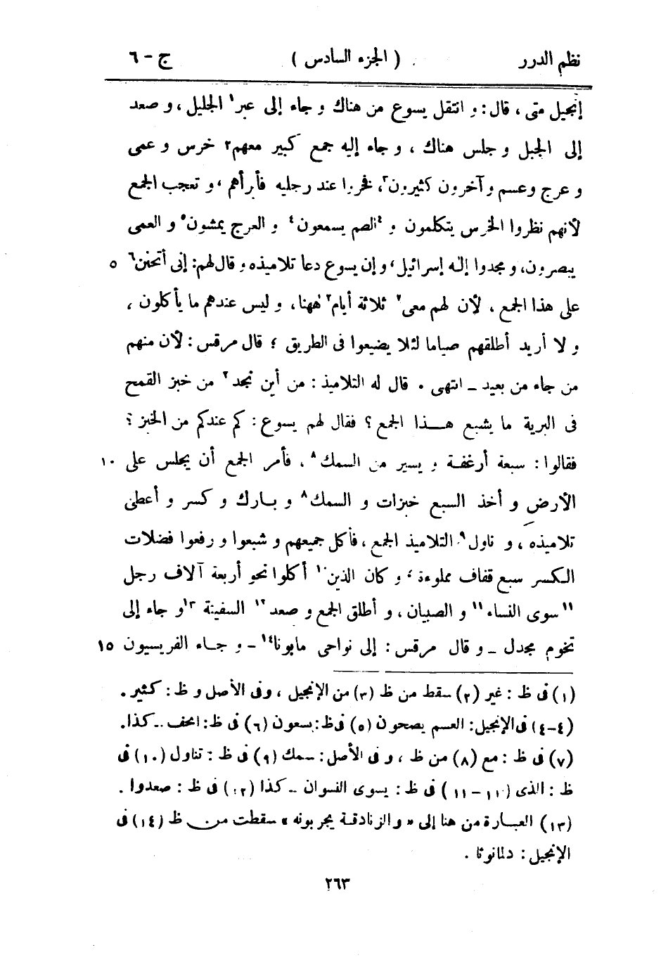 إنجيل متى، قال: وانتقل يسوع من هناك وجاء إلى عبر الجليل، وصعد إلى الجبل وجلس هناك، وجاء إليه جمع كبير معهم خرس وعمى وعرج وعسم وآخرون كثيرون، فخروا عند رجليه فأبرأهم، وتعجب الجمع لأنهم نظروا الخرس يتكلمون والصم يسمعون والعرج يمشون والعمى يبصرون، ومجدوا إله إسرائيل، وإن يسوع دعا تلاميذه وقال لهم: إني أتحنن على هذا الجمع، لأن لهم معي ثلاثة أيام ههنا، وليس عندهم ما يأكلون، ولا أريد أطلقهم صياماً لئلا يضيعوا في الطريق، قال مرقس: لأن منهم من جاء من بعيد - انتهى. قال له التلاميذ: من أين نجد من خبز القمح في البرية ما يشبع هذا الجمع؟ فقال لهم يسوع: كم عندكم من الخبز؟ فقالوا: سبعة أرغفة ويسير من السمك، فأمر الجمع أن يجلس على الأرض وأخذ السبع خبزات والسمك وبارك وكسر وأعطى تلاميذه، وناول التلاميذ الجمع، فأكل جميعهم وشبعوا ورفعوا فضلات الكسر سبع قفاف مملوءة، وكان الذين أكلوا نحو أربعة آلاف رجل سوى النساء والصبيان، وأطلق الجمع وصعد السفينة وجاء إلى تخوم مجدل - وقال مرقس: إلى نواحي مابونا - وجاء الفريسيون