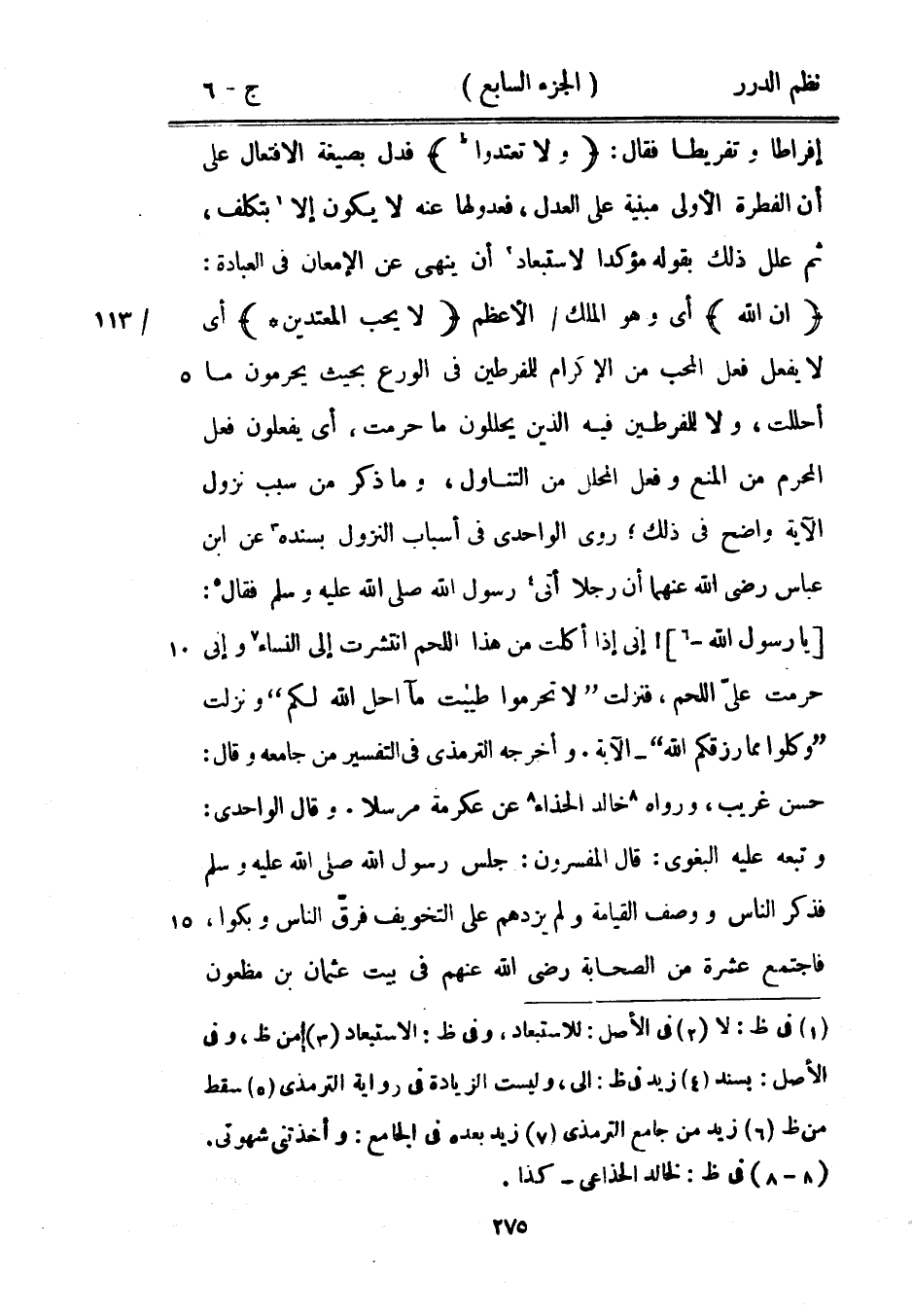 [المائدة: 88] «. وأخرجه الترمذي في التفسير من جامعه وقال: حسن غريب، ورواه خالد الحذاء عن عكرمة مرسلاً. وقال الواحدي: وتبعه عليه البغوي: قال المفسرون:» جلس رسول الله صَلَّى اللهُ عَلَيْهِ وَسَلَّمَ فذكر الناس ووصف القيامة ولم يزدهم على التخويف فرق الناس وبكوا، فاجتمع عشرة من الصحابة رضي الله عنهم في بيت عثمان بن مظعون