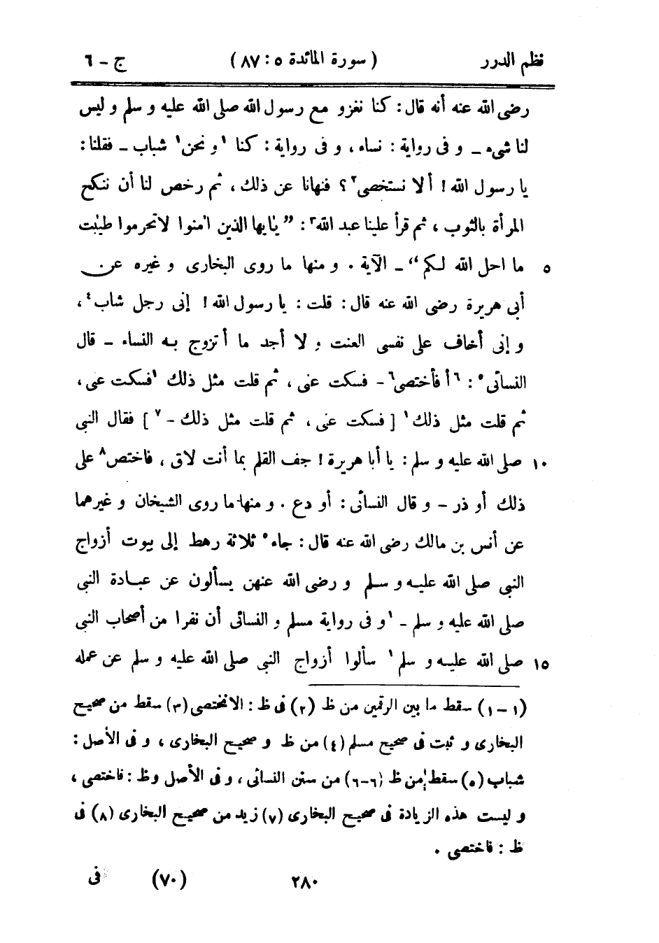 ومنها ما روى البخاري وغيره عن أبي هريرة رضي الله عنه قال: «قلت: يا رسول الله! إني رجل شاب، وإني أخاف على نفسي العنت ولا أجد ما أتزوج به النساء - قال النسائي: أفاختصي - فسكت عني، ثم قلت مثل ذلك، فسكت عني، ثم قلت مثل ذلك فسكت عني، ثم قلت مثل ذلك فقال النبي صَلَّى اللهُ عَلَيْهِ وَسَلَّمَ: يا أبا هريرة! جف القلم بما أنت لاق، فاختص على ذلك أو ذر- وقال النسائي: أو دع» ومنها ما روى الشيخان وغيرهما عن أنس بن مالك رضي الله عنه قال: «جاء ثلاثة رهط إلى بيوت أزواج النبي صَلَّى اللهُ عَلَيْهِ وَسَلَّمَ ورضي الله عنهن يسألون عن عبادة النبي صَلَّى اللهُ عَلَيْهِ وَسَلَّمَ - وفي رواية مسلم والنسائي أن نفراً من أصحاب النبي صَلَّى اللهُ عَلَيْهِ وَسَلَّمَ سألوا أزواج النبي صَلَّى اللهُ عَلَيْهِ وَسَلَّمَ عن عمله