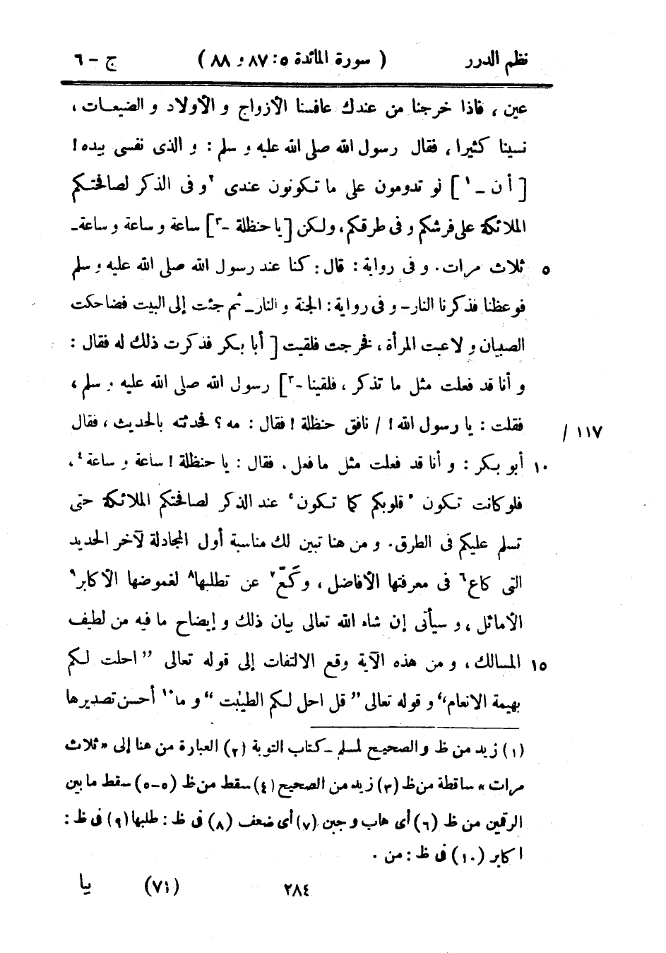 عين، فإذا خرجنا من عندك عافسنا الأزواج والأولاد والضيعات، نسينا كثيراً، فقال رسول الله صَلَّى اللهُ عَلَيْهِ وَسَلَّمَ:» والذي نفسي بيده! أن لو تدومون على ما تكونون عندي وفي الذكر لصافحتكم الملائكة على فرشكم وفي طرقكم، ولكن يا حنظلة ساعة وساعة وساعة - ثلاث مرات «» وفي رواية: قال: «كنا عند رسول الله صَلَّى اللهُ عَلَيْهِ وَسَلَّمَ فوعظنا فذكرنا النار - وفي رواية: الجنة والنار - ثم جئت إلى البيت فضاحكت الصبيان ولاعبت المرأة، فخرجت فلقيت أبا بكر فذكرت ذلك له فقال: وأنا قد فعلت مثل ما تذكر، فلقينا رسول الله صَلَّى اللهُ عَلَيْهِ وَسَلَّمَ، فقلت: يا رسول الله! نافق حنظلة! فقال: مه؟ فحدثته بالحديث، فقال أبو بكر: وأنا قد فعلت مثل ما فعل، فقال: يا حنظلة! ساعة وساعة، فلو كانت تكون قلوبكم كما تكون عند الذكر لصافحتكم الملائكة حتى تسلم عليكم في الطرق»
