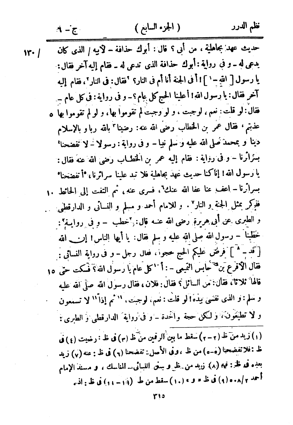 حديث عهد بجاهلية، من أبي؟ قال: أبوك حذافة - لأبيه الذي كان يدعى له - وفي رواية: أبوك حذافة الذي تدعى له - فقام إليه آخر فقال: يا رسول الله أفي الجنة أنا أم في النار؟ فقال: في النار، فقام إليه آخر فقال: يا رسول الله! أعلينا الحج كل عام؟ - وفي رواية: في كل عام - فقال: لو قلت: نعم، لوجبت، ولو وجبت لم تقوموا بها، ولو لم تقوموا بها عذبتم، فقال عمر بن الخطاب رضي الله عنه: رضينا بالله رباً وبالإسلام ديناً وبمحمد صَلَّى اللهُ عَلَيْهِ وَسَلَّمَ نبياً - وفي رواية: رسولاً - لا تفضحنا بسرائرنا - وفي رواية: فقام إليه عمر ابن الخطاب رضي الله عنه فقال: يا رسول الله! إنا كنا حديث عهد بجاهلية فلا تبد علينا سرائرنا، أتفضحنا بسرائرنا - اعف عنا عفا الله عنك، فسرى عنه، ثم التفت إلى الحائط فذكر بمثل الجنة والنار» وللإمام أحمد ومسلم والنسائي والدارقطني والطبري عن أبي هريرة رضي الله عنه قال: خطب - وفي رواية: خطبنا - رسول الله صَلَّى اللهُ عَلَيْهِ وَسَلَّمَ فقال: