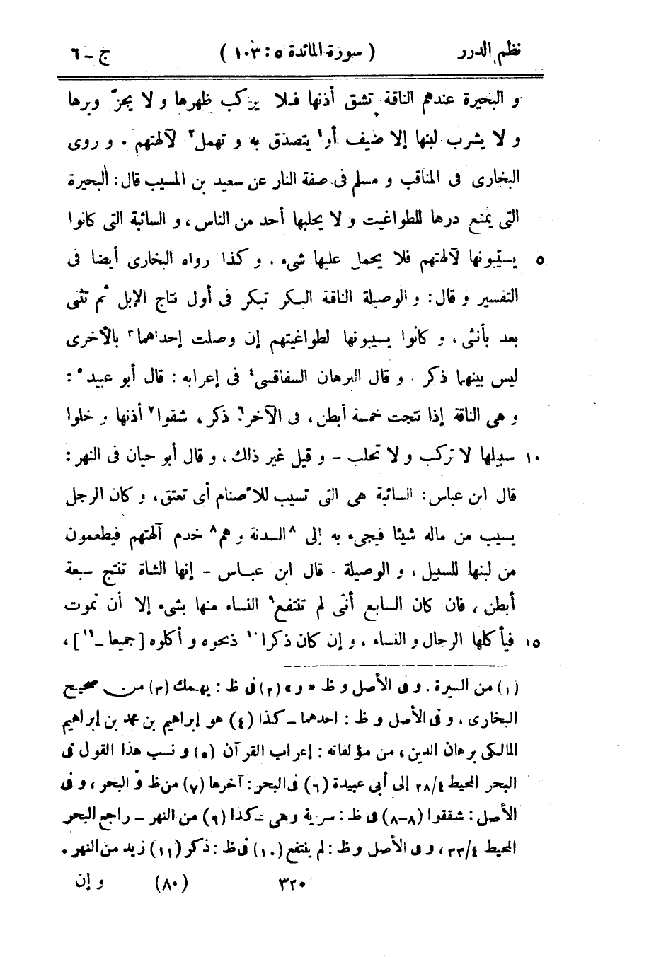 والبحيرة عندهم الناقة تشق أذنها فلا يركب ظهرها ولا يجزّ وبرها ولا يشرب لبنها إلا ضيف أو يتصدق به وتهمل لآلهتهم. وروى البخاري في المناقب ومسلم في صفة النار عن سعيد بن المسيب قال: البحيرة التي يمنع درها للطواغيت ولا يحلبها أحد من الناس، والسائبة التي كانوا يسيّبونها لآلهتهم فلا يحمل عليها شيء. وكذا رواه البخاري أيضاً في التفسير وقال: والوصيلة الناقة البكر تبكر في أول نتاج الإبل ثم تثنى بعد بأنثى. وكانوا يسيبونها لطواغيتهم إن وصلت إحداهما بالأخرى ليس بينهما ذكر وقال البرهان السفاقسي في إعرابه: قال أبو عبيد: وهي الناقة إذا نتجت خمسة أبطن، في الآخر. ذكر، شقوا أذنها وخلو سبيلها لا تركب ولا تحلب - وقيل غير ذلك، وقال أبو حيان في النهر: قال ابن عباس: السائبة هي التي تسيب للأصنام أي تعتق، وكان الرجل يسيب من ماله شيئاً فيجيء به إلى السدنة وهم خدم آلهتهم فيطعمون من لبنها للسبيل، والوصيلة قال ابن عباس - إنها الشاة تنتج سبعة أبطن، فإن كان السابع أنثى لم تنتفع النساء منها بشيء إلا أن تموت فيأكلها الرجال والنساء، وإن كان ذكراً ذبحوه وأكلوه جميعاً،