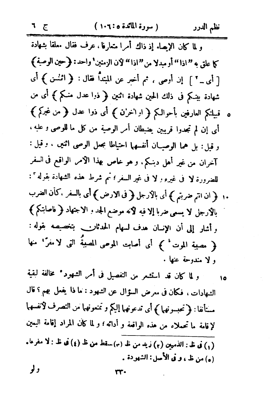 ولما كان الإيصاء إذ ذاك أمراً متعارفاً، عرف فقال معلقاً بشهادة كما علق به {إذا} أو مبدلاً من {إذا} لأن الزمنين واحد: {حين الوصية} أي إن أوصى، ثم أخبر عن المبتدأ فقال: {اثنان} أي شهادة بينكم في ذلك الحين شهادة اثنين {ذوا عدل منكم} أي من قبيلتكم العارفين بأحوالكم {أو آخران} أي ذوا عدل {من غيركم} أي إن لم تجدوا قريبين يضبطان أمر الوصية من كل ما للوصي وعليه، وقيل: بل هما الوصيان أنفسهما احتياطاً بجعل الوصي اثنين، وقيل: آخران من غير أهل دينكم، وهو خاص بهذا الأمر الواقع في السفر للضرورة لا في غيره ولا في غير السفر؛ ثم شرط هذه الشهادة بقوله: {إن أنتم ضربتم} أي بالأرجل {في الأرض} أي بالسفر، كأن الضرب بالأرجل لا يسمى ضرباً إلا فيه لأنه موضع الجد والاجتهاد {فأصابتكم} وأشار إلى أن الإنسان هدف لسهام الحدثان بتخصيصه بقوله: {مصيبة الموت} أي أصابت الموصي المصيبةُ التي لا مفر منها ولا مندوحة عنها.