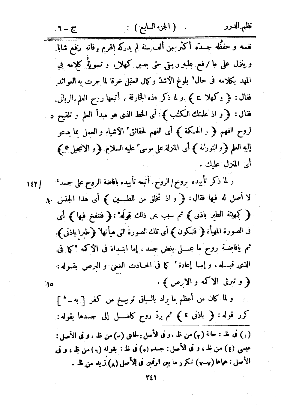 نفسه وحفظُه جسدَه أكثر من ألف سنة لم يدركه الهرم؛ فإنه رفع شاباً وينزل على ما رفع عليه ويبقى حتى يصير كهلاً، وتسويةُ كلامه في المهد بكلامه في حال بلوغ الأشدّ وكمال العقل خرقاً لما جرت به العوائد فقال: {وكهلاً} ولما ذكر هذه الخارقة، أتبعها روح العلم الرباني فقال: {وإذ علمتك الكتاب} أي الخط الذي هو مبدأ العلم وتلقيح لروح الفهم {والحكمة} أي الفهم لحقائق الأشياء والعمل بما يدعو إليه العلم {والتوراة} أي المنزلة على موسى عليه السلام {والإنجيل} أي المنزل عليك.