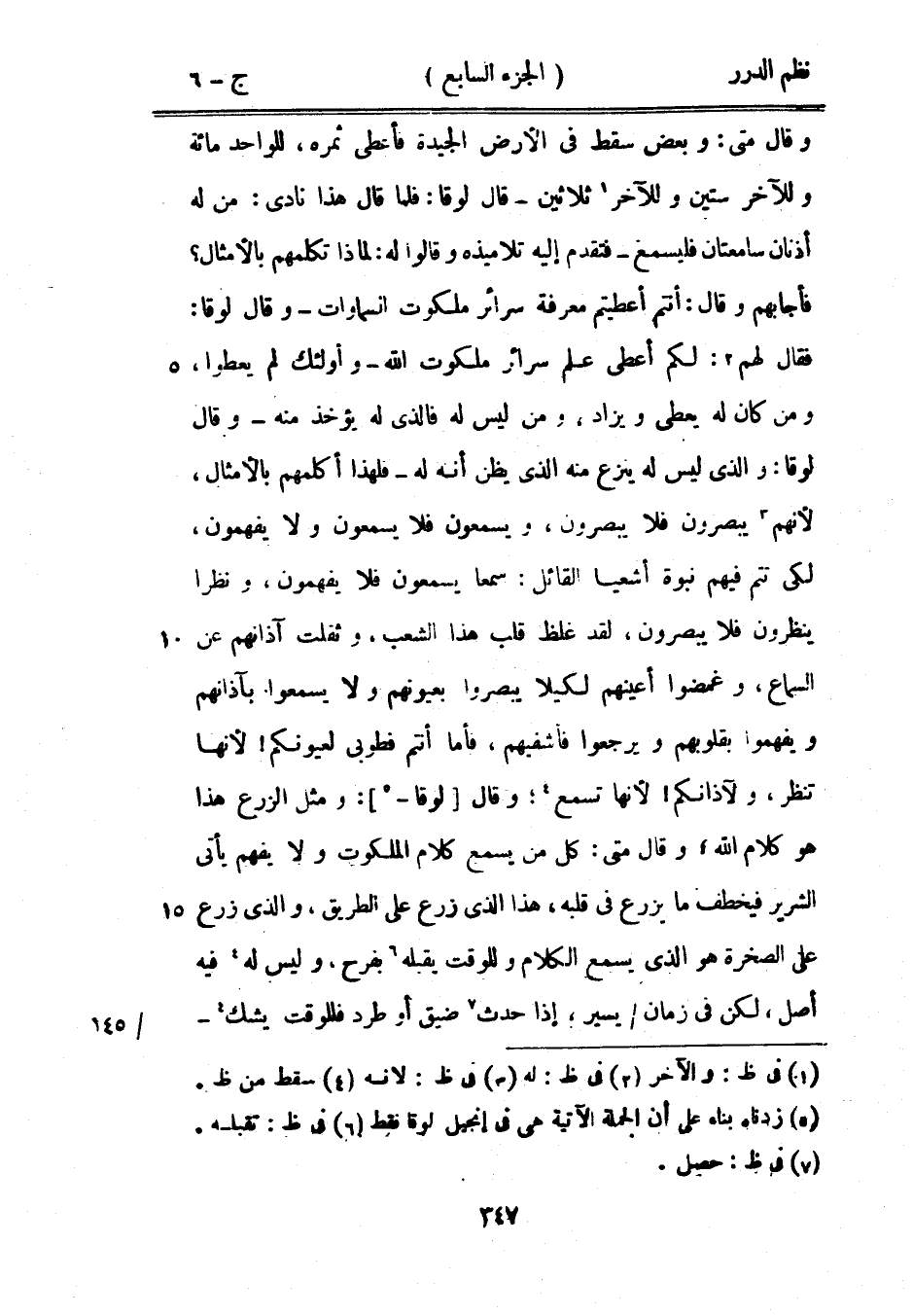 وقال متى: وبعض سقط في الأرض الجيدة فأعطى ثمره، للواحد مائة وللآخر ستين وللآخر ثلاثين - قال لوقا: فلما قال هذا نادى: من له أذنان سامعتان فليسمع - فتقدم إليه تلاميذه وقالوا له: لماذا تكلمهم بالأمثال؟ فأجابهم وقال: أنتم أعطيتم معرفة سرائر ملكوت السماوات - وقال لوقا: فقال لهم: لكم أعطي علم سرائر ملكوت الله - وأولئك لم يعطوا، ومن كان له يعطي ويزاد، ومن ليس له فالذي له يؤخذ منه - وقال لوقا: والذي ليس له ينزع منه الذي يظن أنه له - فلهذا أكلمهم بالأمثال، لأنهم يبصرون فلا يبصرون، ويسمعون فلا يسمعون ولا يفهمون، لكي تتم فيهم نبوة أشعيا لقائل: سمعاً يسمعون فلا يفهمون، ونظراً ينظرون فلا يبصرون، لقد غلظ قلب هذا الشعب، وثقلت آذانهم عن السماع، وغمضوا أعينهم لكيلا يبصروا بعيونهم ولا يسمعوا بآذانهم ويفهموا بقلوبهم ويرجعوا فأشفيهم، فأما أنتم فطوبى لعيونكم! لأنها تنظر، ولآذانكم! لأنها تسمع؛ وقال لوقا: ومثل الزرع هذا هو كلام الله؛ وقال متى: كل من يسمع كلام الملكوت ولا يفهم يأتي الشرير فيخطف ما يزرع في قلبه، هذا الذي زرع على الطريق، والذي زرع على الصخرة هو الذي يسمع الكلام وللوقت يقبله بفرح، وليس له فيه أصل، لكن في زمان يسير، إذا حدث ضيق أو طرد فللوقت يشك -