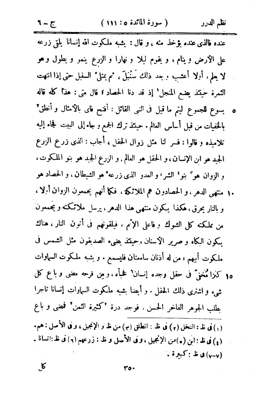 عنده فالذي عنده يؤخذ منه، وقال: يشبه ملكوت الله إنساناً يلقي زرعه على الأرض وينام، ويقوم ليلاً ونهاراً والزرع ينمو ويطول وهو لا يعلم، أولاً أعشب وبعد ذلك سَنُبل، ثم يمتلئ السنبل حتى إذا انتهت الثمرة حينئذ يضع المنجل إذ قد دنا الحصاد؛ قال متى: هذا كله قاله يسوع للجموع ليتم ما قيل في النبي القائل: أفتح فاي بالأمثال وأنطق بالخفيات من قبل أساس العالم. حينئذ ترك الجمع وجاء إلى البيت فجاء إليه تلاميذه وقالوا: فسر لنا مثل زوال الحقل، أجاب: الذي زرع الزرع الجيد هو ابن الإنسان، والحقل هو العالم، والزرع الجيد هو بنو الملكوت، والزوان هو بنو الشر، والعدو الذي زرعه هو الشيطان، والحصاد هو منتهى الدهر، والحصادون هم الملائكة، فكما أنهم يجمعون الزوان أولاً، وبالنار يحرق، هكذا يكون منتهى هذا الدهر، يرسل ملائكته ويجمعون من مملكته كل الشوك وفاعلي الإثم، فيلقونهم في أتون النار، هناك يكون البكاء وصرير الأسنان، حينئذ يضيء الصديقون مثل الشمس في ملكوت أبيهم، من له أذنان سامعتان فليسمع. ويشبه ملكوت السماوات كنزاً مُخفىّ في حقل وجده إنسان فخبأه، ومِن فرحه مضى وباع كل شيء واشترى ذلك الحقل. وأيضاً يشبه ملكوت السماوات إنساناً تاجراً بطلب الجوهر الفاخر الحسن. فوجد درة كثيرة الثمن فمضى وباع
