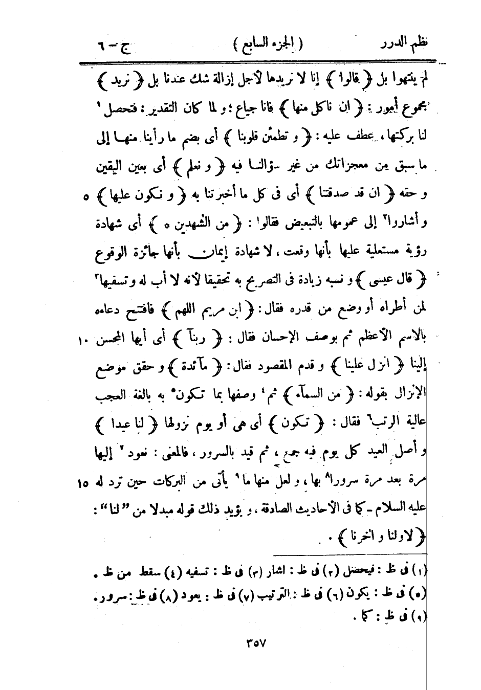 لم ينتهوا بل {قالوا} إنا لا نريدها لأجل إزالة شك عندنا بل {نريد} مجموع أمور: {أن نأكل منها} فإنا جياع؛ ولما كان التقدير: فتحصل لنا بركتها، عطف عليه: {وتطمئن قلوبنا} أي بضم ما رأينا منها إلى ما سبق من معجزاتك من غير سؤالنا فيه {ونعلم} أي بعين اليقين وحقه أن قد صدقتنا} أي في كل ما أخبرتنا به {ونكون عليها} وأشاروا إلى عمومها بالتبعيض فقالوا: {من الشاهدين *} أي شهادة رؤية مستعلية عليها بأنها وقعت، لا شهادة إيمان بأنها جائزة الوقوع {قال عيسى} ونسبه زيادة في التصريح به تحقيقاً ولأنه لا أب له وتسفيهاً لمن أطراه أو وضع من قدره فقال: {ابن مريم اللهم} فافتتح دعاءه بالاسم الأعظم ثم بوصف الإحسان فقال: {ربنا} أي أيها المحسن إلينا {أنزل علينا} وقدم المقصود فقال: {مائدة} وحقق موضع الإنزال بقوله: {من السماء} ثم وصفها بما تكون به بالغة العجب عالية الرتب فقال: {تكون} أي هي أو يوم نزولها {لنا عيداً} وأصل العيد كل يوم فيه جمع، ثم قيد بالسرور فالمعنى: نعود إليها مرة بعد مرة سروراً بها، ولعل منها ما يأتي من البركات حين ترد له عليه السلام - كما في الأحاديث الصادقة، ويؤيد ذلك قوله مبدلاً من «لنا» : {لأولنا وآخرنا} .