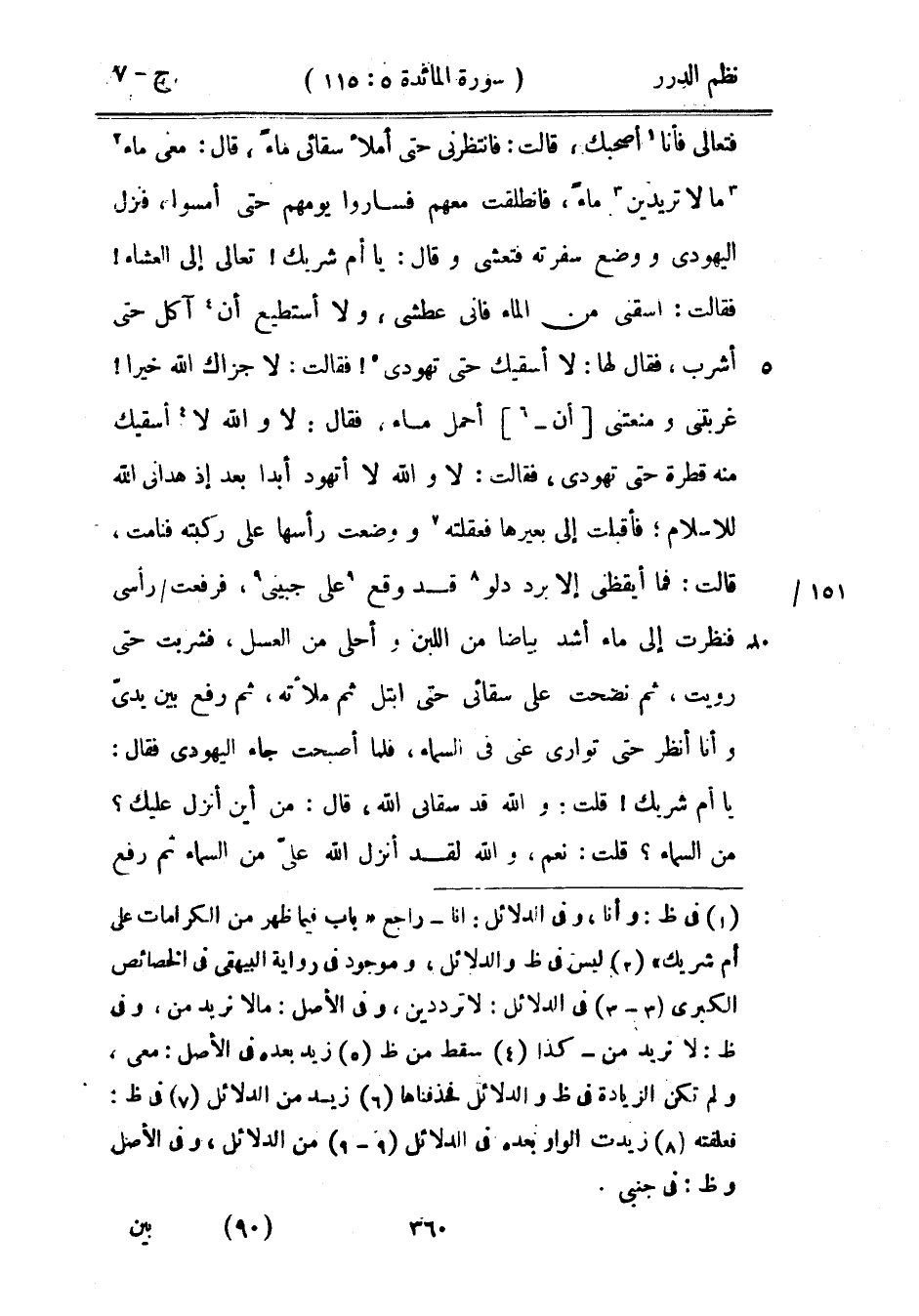 فتعالي فأنا أصحبك، قالت: فانتظرني حتى أملأ سقائي ماءً، قال: معي ماء ما لا تريدين ماءً، فانطلقت معهم فساروا يومهم حتى أمسوا، فنزل اليهودي ووضع سفرته فتعشى وقال: يا أم شريك! تعالي إلى العشاء! فقالت: اسقني من الماء فإني عطشى، ولا أستطيع أن آكل حتى أشرب، فقال لها: لا أسقيك حتى تهودي! فقالت: لا جزاك الله خيراً! غربتني ومنعتني أن أحمل ماء، فقال: لا والله لا أسقيك منه قطرة حتى تهودي، فقالت: لا والله لا أتهود أبداً بعد إذ هداني الله للإسلام؛ فأقبلت إلى بعيرها فعقلته ووضعت رأسها على ركبته فنامت، قالت: فما أيقظني إلا برد دلو قد وقع على جبيني، فرفعت رأسي فنظرت إلى ماء أشد بياضاً من اللبن وأحلى من العسل، فشربت حتى رويت، ثم نضحت على سقائي حتى ابتل ثم ملأته، ثم رفع بين يديّ وأنا أنظر حتى توارى عني في السماء، فلما أصبحت جاء اليهودي فقال: يا أم شريك! قلت: والله قد سقاني الله، قال: من أين أنزل عليك؟ من السماء؟ قلت: نعم، والله لقد أنزل الله عليّ من السماء ثم رفع