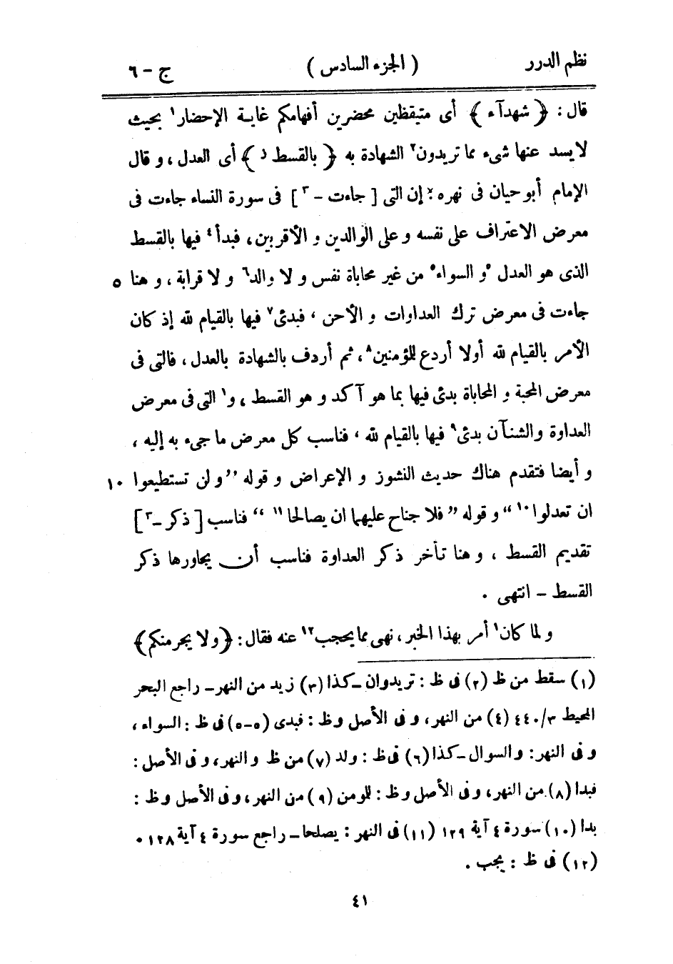 قال: {شهداء} أي متيقظين محضرين أفهامكم غاية الإحضار بحيث لا يسد عنها شيء مما تريدون الشهادة به {بالقسط} أي العدل، وقال الإمام أبو حيان في نهره: إن التي جاءت في سورة النساء جاءت في معرض الاعتراف على نفسه وعلى الوالدين والأقربين، فبدأ فيها بالقسط الذي هو العدل والسواء من غير محاباة نفس ولا والد ولا قرابة، وهنا جاءت في معرض ترك العداوات والاحن، فبدىء فيها بالقيام لله إذ كان الأمر بالقيام لله أولاً أردع للمؤمنين، ثم أردف بالشهادة بالعدل، فالتي في معرض المحبة والمحاباة بدىء فيها بما هو آكد وهو القسط، والتي في معرض العدواة والشنآن، بدىء فيها بالقيام لله، فناسب كل معرض ما جيء به إليه، وأيضاً فتقدم هناك حديث النشوز والإعراض وقوله {ولن تستطيعوا أن تعدلوا} [النساء: 129] وقوله {فلا جناح عليهما أن يصلحا} [النساء: 128] فناسب ذكر تقديم القسط، وهنا تأخر ذكر العداوة فناسب أن يجاورها ذكر القسط - انتهى.