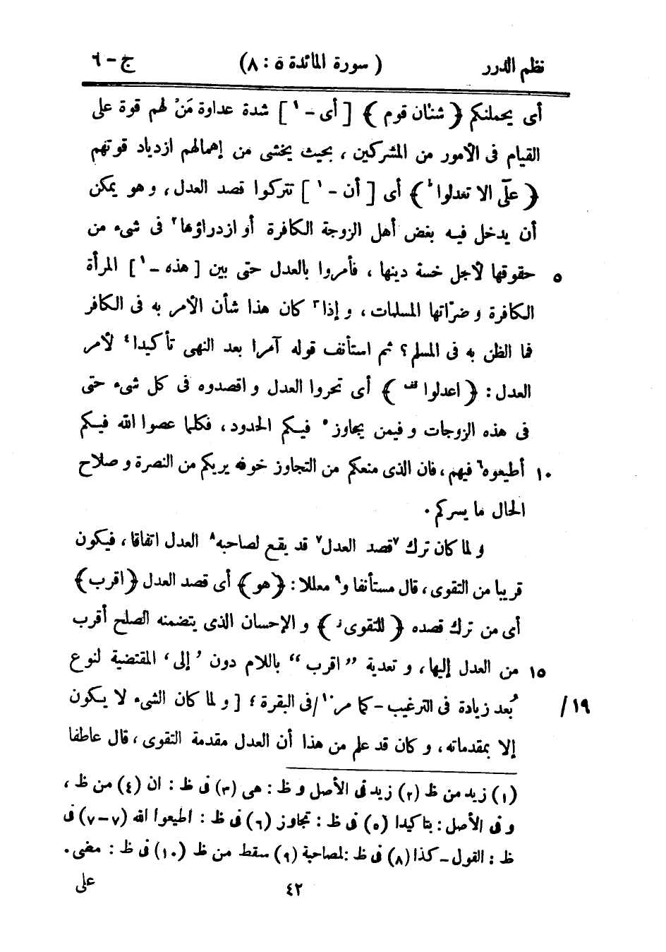 أي يحملنكم {شنئان قوم} أي شدة عداوة من لهم قوة على القيام في الأمور من المشركين، بحيث يخشى من إهمالهم ازدياد قوتهم {على ألا تعدلوا} أي أن تتركوا قصد العدل، وهو يمكن أن يدخل فيه بغض أهل الزوجة الكافرة أو ازدراؤها في شيء من حقوقها لأجل خسة دينها، فأمروا بالعدل حتى بين هذه المرأة الكافرة وضرّاتها المسلمات، وإذا كان هذا شأن الأمر به في الكافر فما الظن به في المسلم؟ ثم استأنف قوله آمراً بعد النهي تأكيداً لأمر العدل: {اعدلوا} أي تحروا العدل واقصدوه في كل شيء حتى في هذه الزوجات وفيمن يجاوز فيكم الحدود، فكلما عصوا الله فيكم أطيعوه فيهم، فإن الذي منعكم من التجاوز وفيمن يجاوز فيكم الحدود، فكلما عصوا الله فيكم أطيعوه فيهم، فإن الذي منعكم من التجاوز خوفه يريكم من النصرة وصلاح الحال ما يسركم.