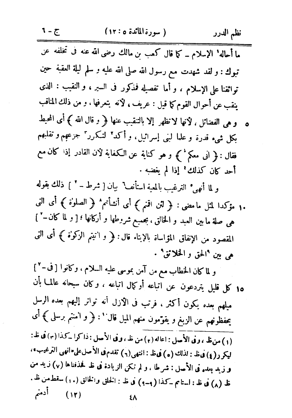 ما أحاله الإسلام - كما قال كعب بن مالك رضي الله عنه في تخلفه عن تبوك: «ولقد شهدت مع رسول الله صَلَّى اللهُ عَلَيْهِ وَسَلَّمَ ليلة العقبة حين تواثقنا على الإسلام» وأما تفصيله فمذكور في السير، والنقيب: الذي ينقب عن أحوال القوم كما قيل: عريف، لأنه يتعرفها، ومن ذلك المناقب وهي الفضائل، لأنها لا تظهر إلا بالتنقيب عنها {وقال الله} أي المحيط بكل شيء قدرة وعلماً لبني إسرائيل، وأكد لتكرر جزعهم وتقلبهم فقال: {إني معكم} وهو كناية عن الكفاية لأن القادر إذا كان مع أحد كان كذلك إذا لم يغضبه.