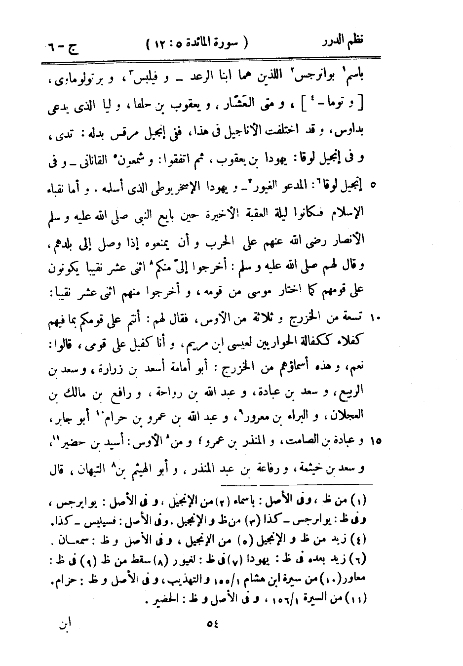 باسم بوانرجس اللذين هما ابنا الرعد - وفيلبس، وبرتولوماوي، وتوما، ومتى العَشّار، ويعقوب بن حلفا، وليا الذي يدعى بداوس وقد اختلفت الأناجيل في هذا، ففي إنجيل مرقس بدله: تدي، وفي إنجيل لوقا: يهودا بن يعقوب، ثم اتفقوا: وشمعون القاناني - وفي إنجيل لوقا: المدعو الغيور - ويهودا الإسخريوطي الذي أسلمه. وأما نقباء الإسلام فكانوا ليلة العقبة الأخيرة حين بايع النبي صَلَّى اللهُ عَلَيْهِ وَسَلَّمَ الأنصار رضي الله عنهم على الحرب وأن يمنعوه إذا وصل إلى بلدهم، وقال لهم صَلَّى اللهُ عَلَيْهِ وَسَلَّمَ: «أخرجوا إلي منكم اثني عشر نقيباً يكونون على قومهم كما اختار موسى من قومه، وأخرجوا منهم اثني عشر نقيباً: تسعة من الخزرج وثلاثة من الأوس، فقال لهم: أنتم على قومكم بما فيهم كفلاء ككفالة الحواريين لعيسى ابن مريم، وأنا كفيل على قومي، قالوا: نعم، وهذه اسماؤهم من الخزرج: أبو أمامة أسعد بن زرارة، وسعد بن الربيع، وسعد بن عبادة، وعبد الله بن رواحة، ورافع بن مالك بن العجلان، والبراء بن معرور، وعبد الله بن عمرو بن حرام أبو جابر، وعبادة بن الصامت، والمنذر بن عمرو؛ ومن الأوس: أسيد بن حضير، وسعد بن خثيمة، ورفاعة بن عبد المنذر، وأبو الهيثم بن التيهان، قال