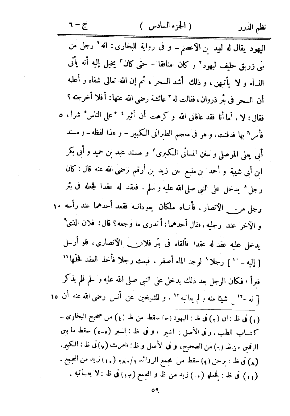 اليهود يقال له لبيد بن الأعصم وفي رواية للبخاري: إنه رجل من بني زريق حليف ليهود وكان منافقاً - حتى كان يخيل إليه أنه يأتي النساء ولا يأتيهن، وذلك أشد السحر، ثم إن الله تعالى شفاه وأعلمه أن السحر في بئر ذروان، فقالت له عائشة رضي الله عنها: أفلا أخرجته؟ فقال: لا، أما أنا فقد عافاني الله وكرهت أن أثير على الناس شراً، فأمر بها فدفنت، وهو في معجم الطبراني الكبير - وهذا لفظه - ومسند أبي يعلى الموصلي وسنن النسائي الكبرى ومسند عبد بن حميد وأبي بكر بن أبي شيبة وأحمد بن منيع عن زيد بن أرقم رضي الله عنه قال: «كان رجل يدخل على النبي صَلَّى اللهُ عَلَيْهِ وَسَلَّمَ. فعقد له عقداً فجعله في بئر رجل من الأنصار، فأتاه ملكان يعودانه فقعد أحدهما عند رأسه والآخر عند رجليه، فقال أحدهما: أتدري ما وجعه؟ قال: فلان الذي يدخل عليه عقد له عقداً فألقاه في بئر فلان الأنصاري، فلو أرسل إليه رجلاً لوجد الماء أصفر، فبعث رجلاً فأخذ العقد فحلّها فبرأ، فكان الرجل بعد ذلك يدخل على النبي صَلَّى اللهُ عَلَيْهِ وَسَلَّمَ فلم يذكر له شيئاً منه ولم يعاتبه» وللشيخين عن أنس رضي الله عنه «أن