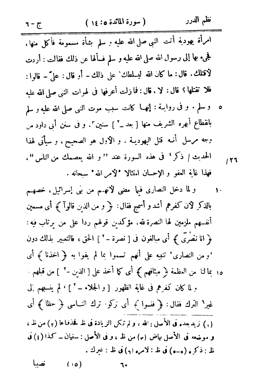 امرأة يهودية أتت النبي صَلَّى اللهُ عَلَيْهِ وَسَلَّمَ بشاة مسمومة فأكل منها، فجيء بها إلى رسول الله صَلَّى اللهُ عَلَيْهِ وَسَلَّمَ فسألها عن ذلك فقالت: أردت لأقتلك، قال: ما كان الله ليسلطك على ذلك - أو قال: عليّ - قالوا: فلا تقتلها؟ قال: لا، قال: فما زلت أعرفها في لهوات النبي صَلَّى اللهُ عَلَيْهِ وَسَلَّمَ. وفي رواية: إنها كانت سبب موت النبي صلى الله عيله وسلم بانقطاع أبهره الشريف منها بعد سنين» وفي سنن أبي داود من وجه مرسل أنه قتل اليهودية. والأول هو الصحيح، وسيأتي لهذا الحديث ذكر في هذه السورة عند {والله يعصمك من الناس} [المائدة: 67] ، فهذا غاية العفو والإحسان امتثالاً لأمر الله سبحانه.