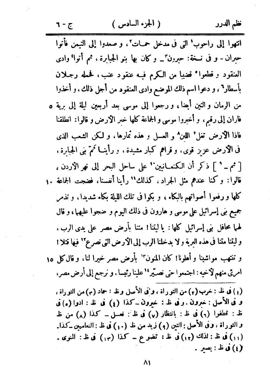 انتهوا إلى راحوب التي في مدخل حمات، وصعدوا إلى التيمن فأتوا حبران - وفي نسخة: حبرون - وكان بها بنو الجبابرة، ثم أتوا وادي العنقود وقطعوا قضيباً من الكرم فيه عنقود عنب، فحمله رجلان بأسطار، ودعوا اسم ذلك الموضع وادي العنقود من أجل ذلك، وأخذوا من الرمان والتين أيضاً، ورجعوا إلى موسى بعد أربعين ليلة إلى برية فاران إلى رقيم، وأخبروا موسى والجماعة كلها خبر الأرض وقالوا: انطلقنا فإذا الأرض تغل اللبن والعسل وهذه ثمارها، ولكن الشعب الذي في الأرض عزيز قوي، وقراهم كبار مشيدة، ورأينا ثَمّ بني الجبابرة، ثم ذكر أن الكنعانيين على ساحل البحر إلى نهر الأردن، قالوا: وكنا عندهم مثل الجراد، كذلك رأينا أنفسنا، فضجت الجماعة كلها ورفعوا أصواتهم بالبكاء، وبكوا في تلك الليلة بكاء شديداً، وتذمر جميع بني إسرائيل على موسى وهارون في ذلك اليوم وضجوا عليهما، وقال لهما محافل بني إسرائيل كلها: يا ليتنا! متنا بأرض مصر على يدي الرب، وليتنا متنا في هذه البرية ولا يدخلنا الرب إلى الإرض التي نصرع فيها قتلاً! وتنتهب مواشينا وأهلونا! كان المنون بأرض مصر خيراً لنا، وقال كل امرىء منهم لأخيه: اجتمعوا حتى نصيّر علينا رئيساً، ونرجع إلى أرض مصر،