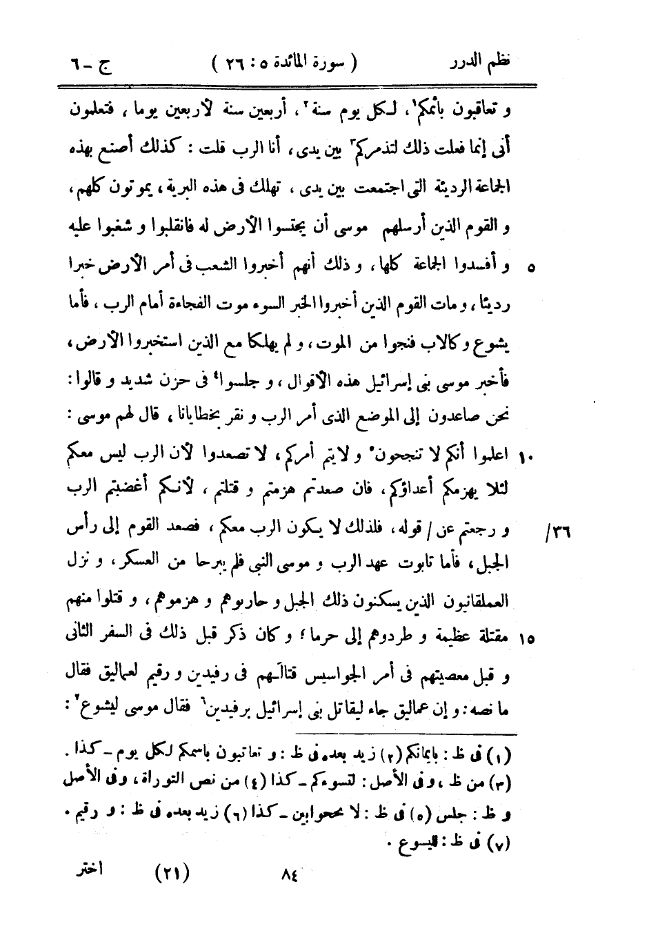 وتعاقبون بإثمكم، لكل يوم سنة، أربعين سنة لأربعين يوماً، فتعلمون أني إنما فعلت ذلك لتذمركم بين يدي، أنا الرب قلت: كذلك أصنع بهذه الجماعة الرديئة التي اجتمعت بين يدي، تهلك في هذه البرية، يموتون كلهم، والقوم الذين أرسلهم موسى أن يجتسوا الأرض له فانقلبوا وشغبوا عليه وأفسدوا الجماعة كلها، وذلك أنهم أخبروا الشعب في أمر الأرض خبراً رديئاً، ومات القوم الذين أخبروا الخبر السوء موت الفجاءة أمام الرب، فأما يشوع وكالاب فنجوا من الموت، ولم يهلكا مع الذين استخبروا الأرض، فأخبر موسى بني إسرائيل هذه الأقوال، وجلسوا في حزن شديد وقالوا: نحن صاعدون إلى الموضع الذي أمر الرب ونقر بخطايانا، قال لهم موسى: اعلموا أنكم لا تنجحون ولا يتم أمركم، لا تصعدوا لأن الرب ليس معكم لئلا يهزمكم أعداؤكم، فإن صعدتم هزمتم وقتلتم، لأنكم أغضبتم الرب ورجعتم عن قوله، فلذلك لا يكون الرب معكم، فصعد القوم إلى رأس الجبل، فأما تابوت عهد الرب وموسى النبي فلم يبرحا من العسكر، ونزل العملقانيون الذين يسكنون ذلك الجبل وحاربوهم وهزموهم، وقتلوا منهم مقتلة عظيمة وطردوهم إلى حرما؛ وكان ذكر قبل ذلك في السفر الثاني وقبل معصيتهم في أمر الجواسيس قتالهم في رفيدين ورقيم لعماليق فقال ما نصه: وإن عماليق جاء ليقاتل بني إسرائيل برفيدين فقال موسى ليشوع: