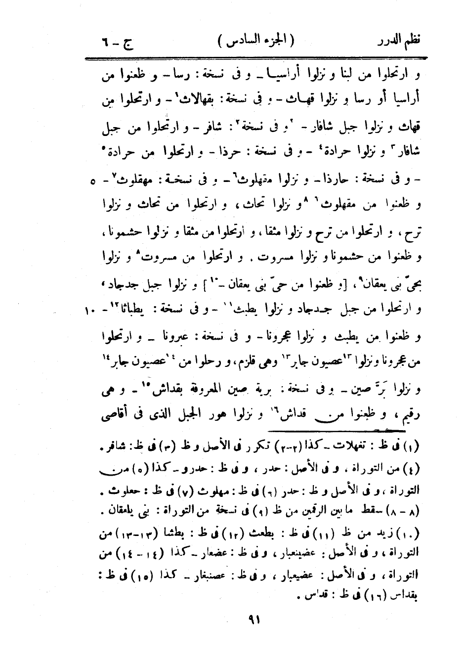 وارتحلوا من لبنا ونزلوا أراسيا - وفي نسخة: رسا - وظعنوا من أراسيا أو رسا ونزلوا قهاث - وفي نسخة: بقهالاث - وارتحلوا من قهاث ونزلوا جبل شافار - وفي نسخة: شافر - وارتحلوا من جبل شافار ونزلوا حرادة - وفي نسخة: حرذا - وارتحلوا من حرادة - وفي نسخة: حارذا - ونزلوا مقهلوث - وفي نسخة: مهقلوث - وظعنوا من مقهلوث نزلوا تحاث - وارتحلوا من تحاث ونزلوا ترح، وارتحلوا من ترح ونزلوا مثقا، وارتحلوا من مثقا ونزلوا حشمونا، وظعنوا من حشمونا ونزلوا مسروت، وارتحلوا من مسروت ونزلوا بحيّ بني يعقان، وظعنوا من حيّ بني يعقان ونزلوا جبل جدجاد، وارتحلوا من جدجاد ونزلوا يطبث - وفي نسخة: يطباثا - وظعنوا من يطبث ونزلوا عجرونا - وفي نسخة: عبرونا - وارتحلوا من عجرونا ونزلوا عصيون جابر وهي قلزم، ورحلوا من عصيون جابر ونزلوا بَرَّصين - وفي نسخة: برية صين المعروفة بقداش - وهي رقيم، وظعنوا من قداش ونزلوا هور الجبل الذي في أقاصي