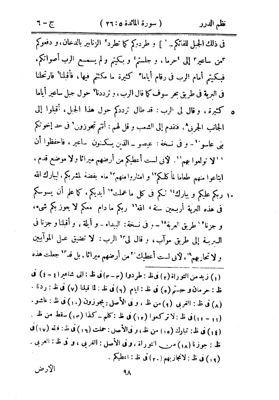 لأني لست أعطيكم من أرضهم ميراثاً ولا موضع قدم، ابتاعوا منهم طعاماً لمأكلكم وامتاروا منهم ماء بفضة لمشربكم، وليبارك الله ربكم عليكم ويبارك لكم في كل ما عملت أيديكم، كما علم أن يسوسكم في هذه البرية أربعين سنة، الله ربكم ما دام معكم لا يعوز بكم شيء، وجزنا طريق العربة - وفي نسخة: البيداء - وأيلة، وأقبلنا وجزنا في البرية إلى طريق موآب، وقال لي الرب: لا تضيق على الموآبيين ولا تحاربهم، لأني لست أعطيك من أرضهم ميراثاً، بل قد جعلت هذه