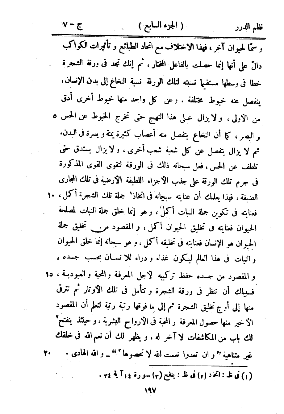 وسمّاً لحيوان آخر، فهذا الاختلاف مع اتحاد الطبائع وتأثيرات الكواكب دالّ على أنها إنما حصلت بالفاعل المختار، ثم إنك تجد في ورقة الشجرة خطاً في وسطها مستقيماً نسبته لتلك الورقة نسبة النخاع إلى بدن الإنسان، ينفصل عنه خيوط مختلفة، وعن كل واحد منها خيوط أخرى أدق من الأولى، ولا يزال على هذا النهج حتى تخرج الخيوط عن الحس والبصر، كما أن النخاع يتفصل منه أعصاب كثيرة يمنة ويسرة في البدن، ثم لا يزال يتفصل عن كل شعبة أخرى، ولا يزال يستدق حتى تلطف عن الحس، فعل سبحانه ذلك في الورقة لتقوى القوى المذكورة في جرم تلك الورقة على جذب الأجزاء اللطيفة الأرضية في تلك المجاري الضيقة، فهذا يعلمك أن عنايته سبحانه في اتخاذ جملة تلك الشجرة أكمل، فعنايته في تكوين جملة النبات أكمل، وهو إنما خلق جملة النبات لمصلحة الحيوان فعنايته في تخليق الحيوان أكمل، والمقصود من تخليق جملة الحيوان هو الإنسان فعنايته في تخليقه أكمل، وهو سبحانه إنما خلق الحيوان والنبات في هذا العالم ليكون غذاء ودواء للإنسان بحسب جسده، والمقصود من جسده حفظ تركيبه لأجل المعرفة والمحبة والعبودية، فسبيلك أن تنظر في ورقة الشجرة وتتأمل في تلك الأوتار ثم تترقى منها إلى أوج تخليق الشجرة ثم إلى ما فوقها رتبة رتبة لتعلم أن المقصود الأخير منها حصول المعرفة والمحبة في الأرواح البشرية، وحينئذ ينفتح لك باب من المكاشفات لا آخر له، ويظهر لك أن نعم الله في خلقك غير متناهية