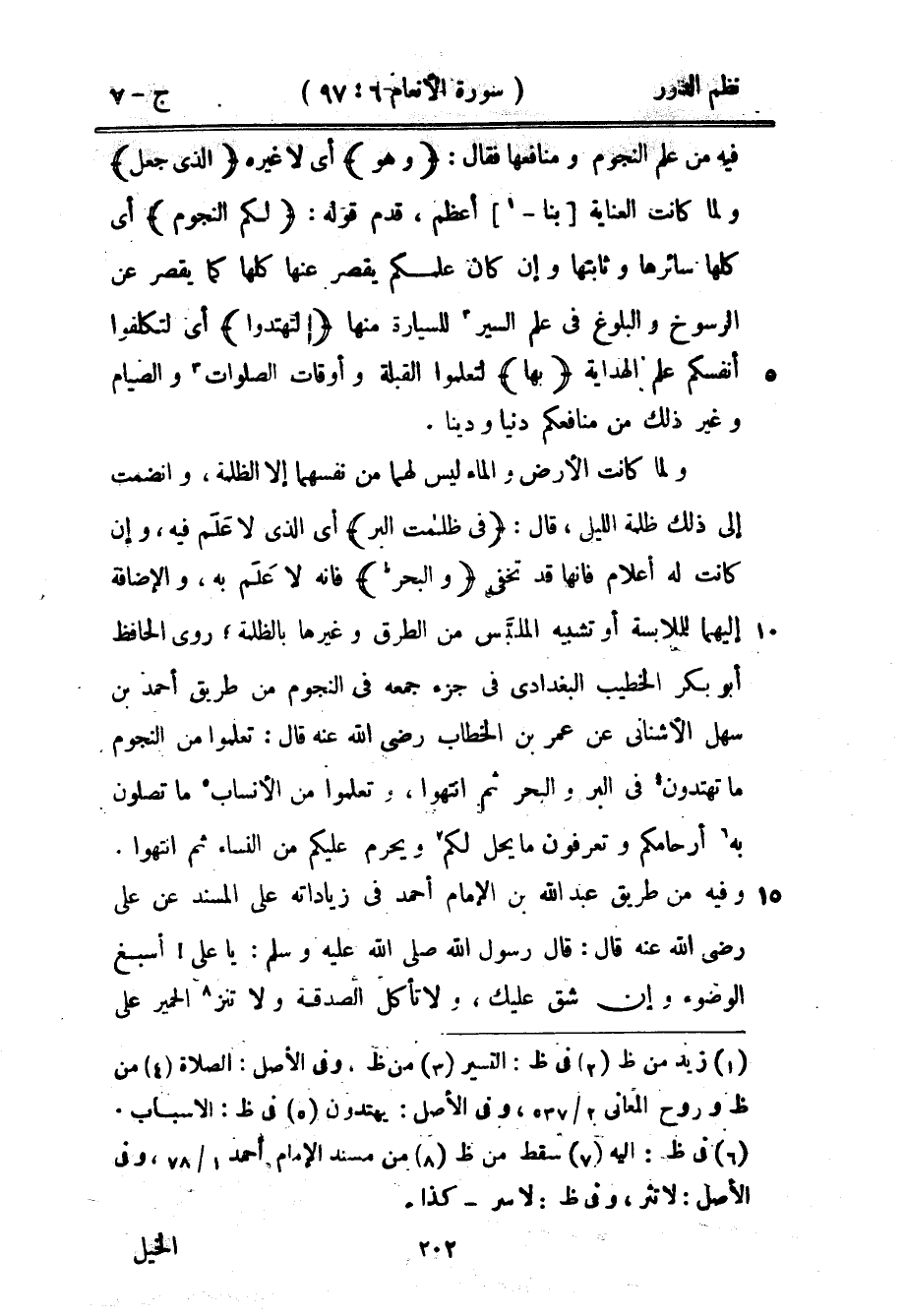 ولما كانت الأرض والماء ليس لهما من نفسهما إلا الظلمة، وانضمت إلى ذلك ظلمة الليل، قال: {في ظلمات البر} أي الذي لا عَلَم فيه، وإن كانت له أعلام فإنها قد تخفى {والبحر} فإنه لا عَلَم به، والإضافة إليهما للملابسة أو تشبيه الملبَّس من الطرق وغيرها بالظلمة؛ روى الحافظ أبو بكر الخطيب البغدادي في جزء جمعه في النجوم من طريق أحمد بن سهل الأشناني عن عمر بن الخطاب رضي الله عنه قال: تعلموا من النجوم ما تهتدون في البر والبحر ثم انتهوا، وتعلموا من الأنساب ما تصلون به أرحامكم وتعرفون ما يحل لكم ويحرم عليكم من النساء ثم انتهوا. وفيه من طريق عبد الله ابن الإمام أحمد في زياداته على المسند عن علي رضي الله عنه قال: قال رسول الله صَلَّى اللهُ عَلَيْهِ وَسَلَّمَ: «يا علي! أسبغ الوضوء وإن شق عليك، ولا تأكل الصدقة ولا تنز الحمير على