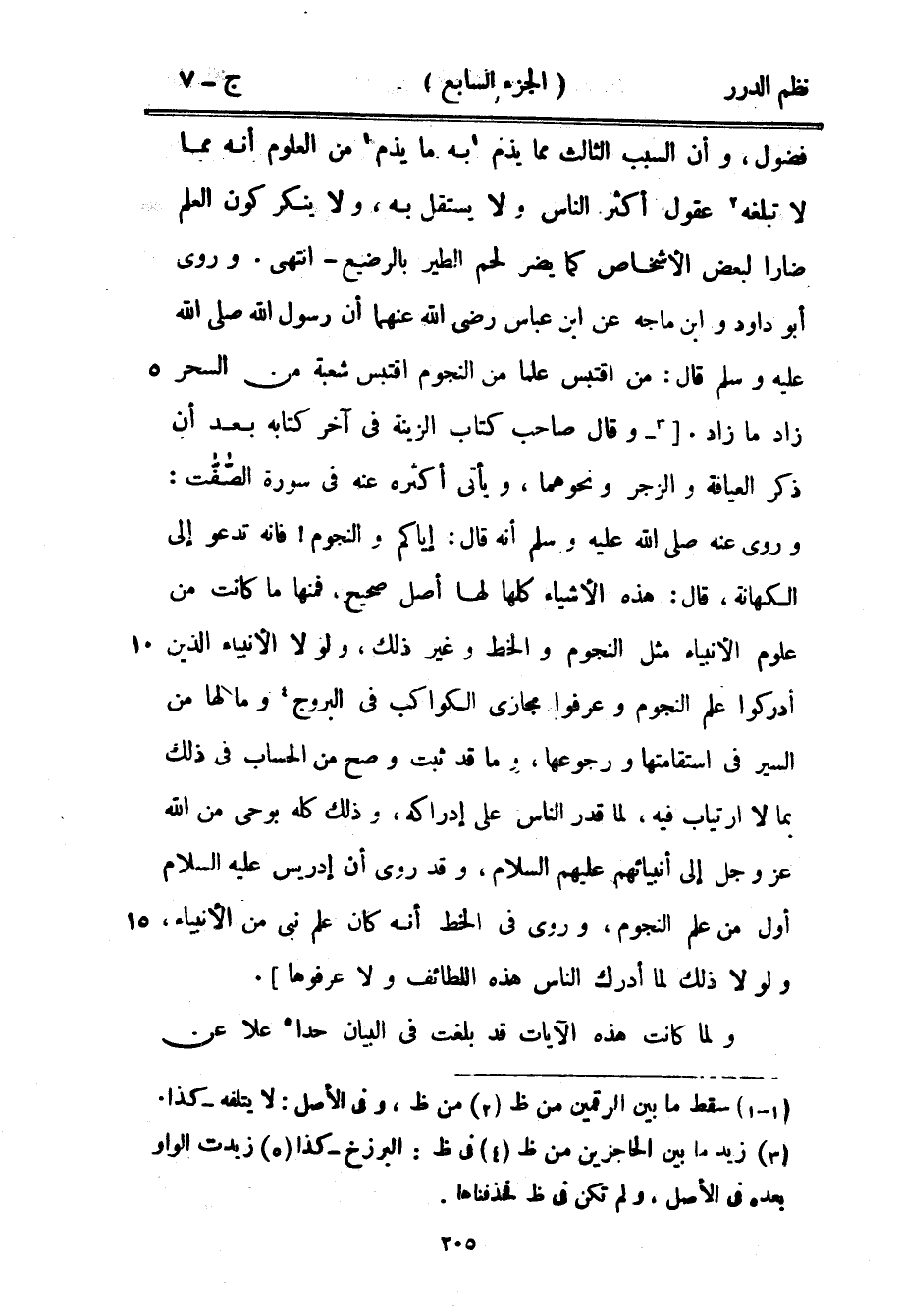 فضول، وأن السبب الثالث مما يذم به ما يذم من العلوم أنه مما لا تبلغه عقول أكثر الناس ولا يستقل به، ولا ينكر كون العلم ضاراً لبعض الأشخاص كما يضر لحم الطير بالرضيع - انتهى. وروى أبو داود وابن ماجه عن ابن عباس رضي الله عنهما أن رسول الله صَلَّى اللهُ عَلَيْهِ وَسَلَّمَ قال: «من اقتبس علماً من النجوم اقتبس شعبة من السحر زاد ما زاد» وقال صاحب كتاب الزينة في آخر كتابه بعد أن ذكر العيافة والزجر ونحوهما، ويأتي أكثره عنه في سورة الصافات: وروي عنه صَلَّى اللهُ عَلَيْهِ وَسَلَّمَ أنه قال: «إياكم والنجوم! فإنها تدعو إلى الكهانة» ، قال: هذه الأشياء كلها لها أصل صحيح، فمنها ما كانت من علوم الأنبياء مثل النجوم والخط وغير ذلك، ولولا الأنبياء الذين أدركوا علم النجوم وعرفوا مجاري الكواكب في البروج وما لها من السير في استقامتها ورجوعها، وما قد ثبت وصح من الحساب في ذلك بما لا ارتياب فيه، لما قدر الناس على إدراكه، وذلك كله بوحي من الله عز وجل إلى أنبيائهم عليهم السلام، وقد روي أن إدريس عليه السلام أول من علم النجوم، وروي في الخط أنه كان علم نبي من الأنبياء، ولولا ذلك لما أدرك الناس هذه اللطائف ولا عرفوها.