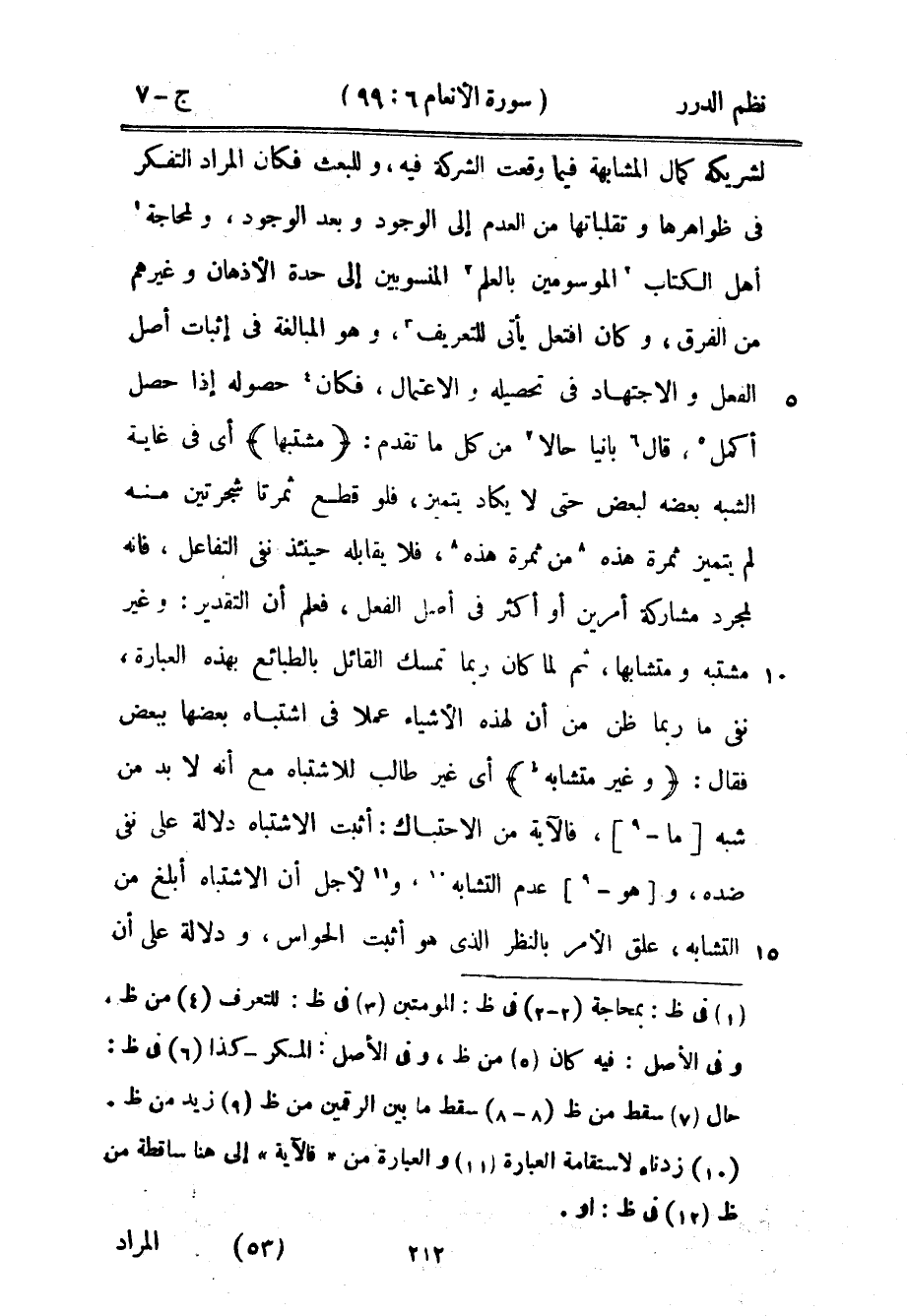 لشريكه كمال المشابهة فيما وقعت الشركة فيه، وللبعث فكان المراد التفكر في ظواهرها وتقلباتها من العدم إلى الوجود وبعد الوجود، ولمحاجة أهل الكتاب الموسومين بالعلم المنسوبين إلى حدة الأذهان وغيرهم من الفرق، وكان افتعل يأتي للتعريف، وهو المبالغة في إثبات أصل الفعل والاجتهاد في تحصيله والاعتمال، فكان حصوله إذا حصل أكمل، قال بانياً حالاً من كل ما تقدم: {مشتبهاً} أي في غاية الشبه بعضه لبعض حتى لا يكاد يتميز، فلو قطع ثمرتا شجرتين منه لم يتميز ثمرة هذه من ثمرة هذه، فلا يقابله حينئذ نفي التفاعل، فإنه لمجرد مشاركة أمرين أو أكثر في أصل الفعل، فعلم أن التقدير: وغير مشتبه ومتشابهاً، ثم لما كان ربما تمسك القائل بالطبائع بهذه العبارة، نفى ما ربما ظن من أن لهذه الأشياء عملاً في اشتباه بعضها ببعض فقال: {وغير متشابه} أي غير طالب للاشتباه مع أنه لا بد من شبه ما، فالآية من الاحتباك: أثبت الاشتباه دلالة على نفي ضده، وهو عدم التشابه، ولأجل أن الاشتباه أبلغ من التشابه، علق الأمر بالنظر الذي هو أثبت الحواس، ودلالة على أن