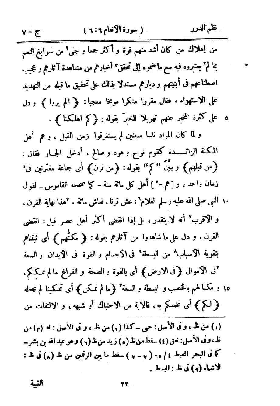 ولما كان المراد ناساً معينين لم يستغرقوا زمن القبل، وهم أهل المكنة الزائدة كقوم نوح وهود وصالح، أدخل الجار فقال: {من قبلهم} وبيَّنَ {كم} بقوله: {من قرن} أي جماعة مقترنين في زمان واحد، وهم أهل كل مائة سنة - كما صححه القاموس لقول النبي صَلَّى اللهُ عَلَيْهِ وَسَلَّمَ لغلام: «عش قرناً» ، فعاش مائة. هذا نهاية القرن، والأقرب أنه لا يتقدر، بل إذا انقضى أكثر أهل عصر قيل: انقضى القرن، ودل على ما شاهدوا من آثارهم بقوله: {مكناهم} أي ثبتناهم بتقوية الأسباب من البسطة في الأجسام والقوة في الأبدان والسعة في الأموال {في الأرض} أي بالقوة والصحة والفراغ ما لم نمكنكم، ومكنا لهم بالخصب والبسطة والسعة {ما لم نمكن} أي تمكيناً لم نجعله {لكم} أي نخصكم به، فالآية من الاحتباك أو شبهه، والالتفات من