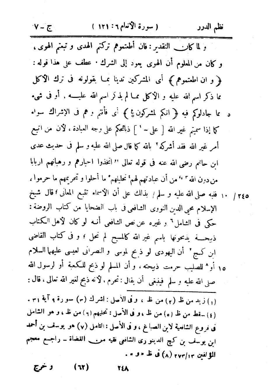 ولما كان التقدير: فإن أطعتموهم تركتم الهدى وتبعتم الهوى، وكان من المعلوم أن الهوى يعود إلى الشرك، عطف على هذا قوله: {وإن أطعتموهم} أي المشركين تديناً بما يقولونه في ترك الأكل مما ذكر اسم الله عليه والأكل مما لم يذكر اسم الله عليه، أو في شيء مما جادلوكم فيه {إنكم لمشركون *} أي فأنتم وهم في الإشراك سواء كما إذا سميتم غير الله على ذبائحكم على وجه العبادة، لأن من اتبع أمر غير الله فقد اشركه بالله كما قال صَلَّى اللهُ عَلَيْهِ وَسَلَّمَ في حديث عدي بن حاتم رضي الله عنه في قوله تعالى {اتخذوا أحبارهم ورهبانهم أرباباً من دون الله} [التوبة: 31] من أن عبادتهم لهم تحليلهم ما أحلوا وتحريمهم ما حرموا، فنبه صَلَّى اللهُ عَلَيْهِ وَسَلَّمَ بذلك على أن الأسماء تتبع المعاني؛ قال شيخ الإسلام محيي الدين النووي الشافعي في باب الضحايا من كتاب الروضة: حكي في الشامل وغيره عن نص الشافعي أنه لو كان لأهل الكتاب ذبيحة يذبحونها باسم غير الله كالمسيح لم تحل؛ وفي كتاب القاضي ابن كنج أن اليهودي لو ذبح لموسى والنصراني لعيسى عليهما السلام أو للصليب حرمت ذبيحته، وأن المسلم لو ذبح للكعبة أو لرسول الله صَلَّى اللهُ عَلَيْهِ وَسَلَّمَ فينبغي أن يقال: تحرم، لأنه ذبح لغير الله تعالى، قال: