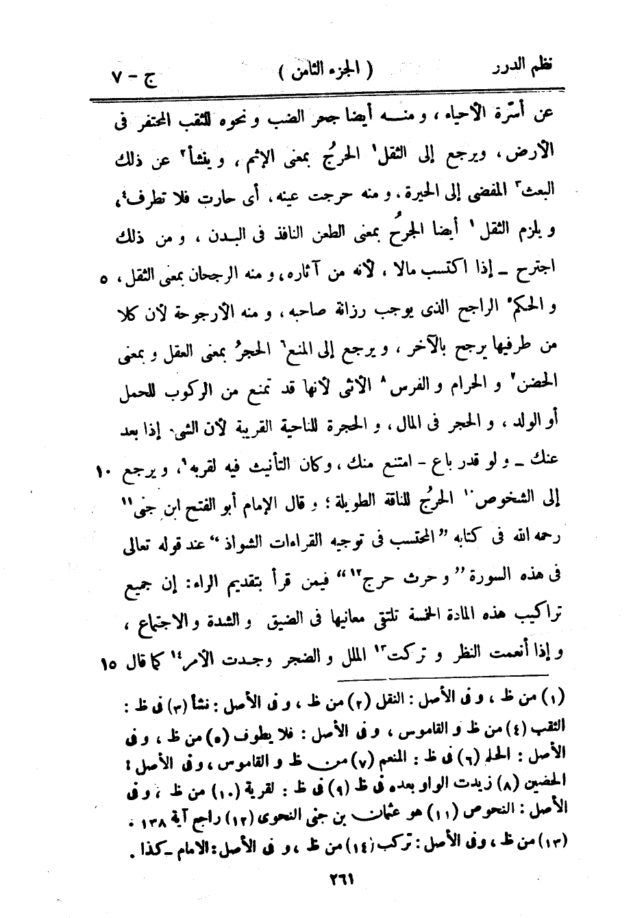 عن أسرّة الأحياء، ومنه أيضاً جحر الضب ونحوه للثقب المحتفر في الأرض، ويرجع إلى الثقل الحرجُ بمعنى الإثم، وينشأ عن ذلك البعث المفضي إلى الحيرة، ومنه حرجت عينه، أي حارت فلا تطرف، ويلزم الثقل أيضاً الجرحُ بمعنى الطعن النافذ في البدن، ومن ذلك اجترح - إذا اكتسب مالاً، لأنه من آثاره، ومنه الرجحان بمعنى الثقل، والحكم الراجح الذي يوجب رزانة صاحبه، ومنه الأرجوحة لأن كلاًّ من طرفيها يرجح بالآخر، ويرجع إلى المنع الحجرُ بمعنى العقل وبمعنى الحضن والحرام والفرس الأنثى لأنها قد تمنع من الركوب للحمل أو الولد، والحجر في المال، والحجرة للناحية القريبة لأن الشيء إذا بعد عنك - ولو قدر باع - امتنع منك، وكان التأنيث فيه لقربه، ويرجع إلى الشخوص الحرجُ للناقة الطويلة؛ وقال الإمام أبو الفتح بن جني رحمه الله في كتابه «المحتسب في توجيه القراءات الشواذ» عند قوله تعالى في هذه السورة «وحرث حرج» فيمن قرأ بتقديم الراء: إن جميع تراكيب هذه المادة الخمسة تلتقي معانيها في الضيق والشدة والاجتماع، وإذا أنعمت النظر وتركت الملل والضجر وجدت الأمر كما قال -