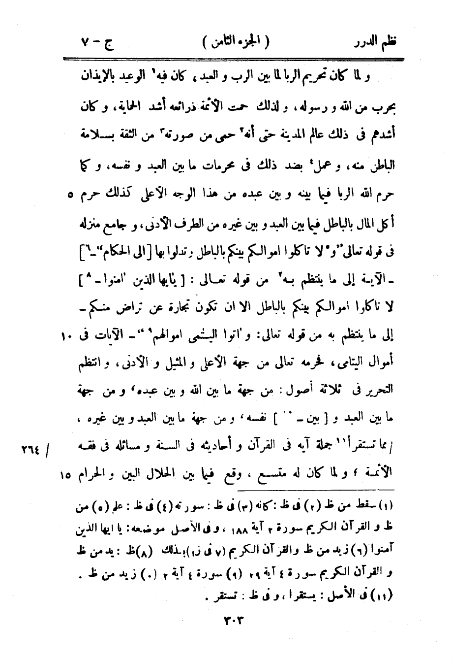 ولما كان تحريم الربا بين الرب والعبد، كان فيه الوعيد بالإيذان بحرب من الله ورسوله، ولذلك حمت الأئمة ذرائعه أشد الحماية، وكان أشدهم في ذلك عالم المدينة حتى أنه حمي من صورته من الثقة بسلامة الباطن منه، وعمل بضد ذلك في محرمات ما بين العبد ونفسه، وكما حرم الله الربا فيما بينه وبين عبده من هذا الوجه الأعلى كذلك حرم أكل المال بالباطل فيما بين العبد وبين غيره من الطرف الأدنى، وجامع منزله في قوله تعالى: {ولا تأكلوا أموالكم بينكم بالباطل وتدلوا بها إلى الحكام} [البقرة: 188]- الآية إلى ما ينتظم به من قوله تعالى {يا أيها الذين آمنوا لا تأكلوا أموالكم بينكم بالباطل إلا أن تكون تجارة عن تراض منكم} [النساء: 29] إلى ما ينتظم به من قوله تعالى: {وآتوا اليتامى أموالهم} [النسا: 2]- الآيات في أموال اليتامى، فحرمه تعالى من جهة الأعلى والمثيل والأدنى، وانتظم التحرير في ثلاثة أصول: من جهة ما بين الله وبين عبده ومن جهة ما بين العبد وبين نفسه، ومن جهة ما بين العبد وبين غيره، مما تستقرأ جملة آية في القرآن وأحاديثه في السنة ومسائله في فقه الأئمة؛ ولما كان له متسع، وقع فيما بين الحلال البين والحرام