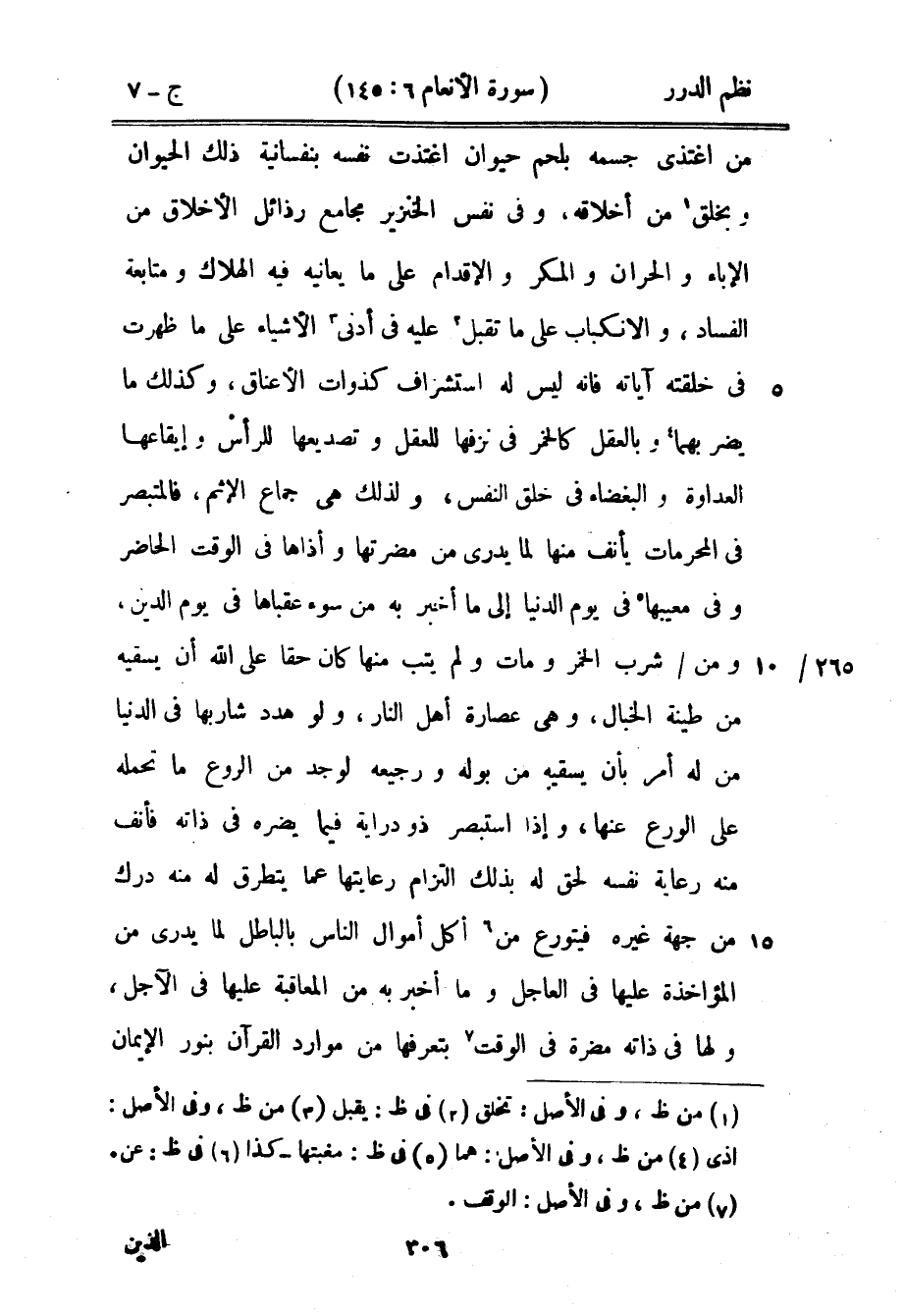 من اعتذى جسمه بلحم حيوان اغتذت نفسه بنفسانية ذلك الحيوان وبخلق من أخلاقه، وفي نفس الخنزير مجامع رذائل الأخلاق من الإباء والحران والمكر والإقدام على ما يعانيه فيه الهلاك ومتابعة الفساد، والانكباب على ما تقبل عليه في أدنى الأشياء على ما أظهرت في خلقته آياته فإنه ليس له استشراف كذوات الأعناق، وكذلك ما يضر بهما وبالعقل كالخمر في نزفها للعقل وتصديعها للرأس وإيقاعها العداوة والبغضاء في خلق النفس، ولذلك هي جماع الإثم، فالمتبصر في المحرمات يأنف منها لما يدري من مضرتها وأذاها في الوقت الحاضر وفي معيبها في يوم الدنيا إلى ما أخبر به من سوء عقباها في يوم الدين، ومن شرب الخمر ومات ولم يتب منها كان حقاً على الله أن يسقيه من طينة الخبال، وهي عصارة أهل النار، ولو هدد شاربها في الدنيا من له أمر بأن يسقيه من بوله ورجيعه لوجد من الروع ما تحمله على الورع عنها، وإذا استبصر ذو دراية فيما يضره في ذاته فأنف منه رعاية نفسه لحق له بذلك التزام رعايتها عما يتطرق له منه درك من جهة غيره فيتورع من أكل أموال الناس بالباطل لما يدري من المؤاخذة عليها في العاجل وما أخبر به من المعاقبة عليها في الآجل، ولها في ذاته مضرة في الوقت بتعرفها من موارد القرآن بنور الإيمان