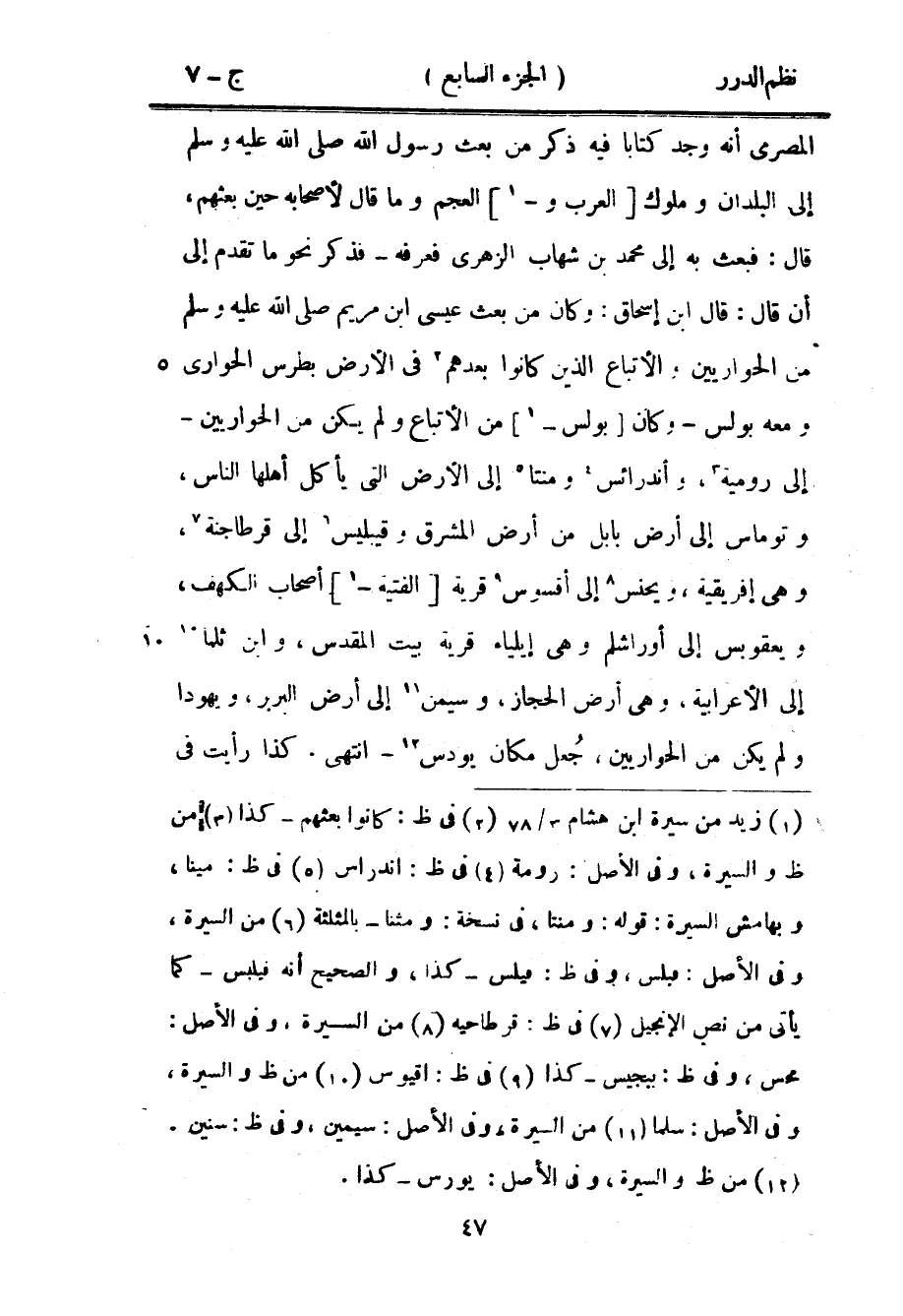 المصري أنه وجد كتاباً فيه ذكر من بعث رسول الله صَلَّى اللهُ عَلَيْهِ وَسَلَّمَ إلى البلدان وملوك العرب والعجم وما قال لأصحابه حين بعثهم، قال: فبعث به إلى محمد بن شهاب الزهري فعرفه - فذكر نحو ما تقدم إلى أن قال: قال ابن إسحاق: وكان من بعث عيسى ابن مريم صَلَّى اللهُ عَلَيْهِ وَسَلَّمَ من الحواريين والأتباع الذين كانوا بعدهم في الأرض بطرس الحواري ومعه بولس - وكان بولس من الأتباع ولم يكن من الحواريين - إلى رومية، وأندرائس ومنتا إلى الأرض التي يأكل أهلها الناس، وتوماس إلى أرض بابل من أرض المشرق وقيبليس إلى قرطاجنة، وهي إفريقية، ويحنس إلى أقسوس قرية الفتية أصحاب الكهف، ويعقوبس إلى أوراشلم وهي إيلياء قرية بيت المقدس، وابن ثلما إلى الأعرابية، وهي أرض الحجاز، وسيمن إلى أرض البربر، ويهودا ولم يكن من الحواريين، جُعل مكان يودس - انتهى. كذا رأيت في