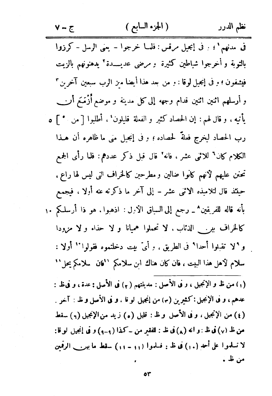 في مدنهم؛ وفي إنجيل مرقس: فلما خرجوا - يعني الرسل - كرزوا بالتوبة وأخرجوا شياطين كثيرة ومرضى عديدة يدهنونهم بالزيت فيشفون؛ وفي إنجيل لوقا: ومن بعد هذا أيضاً ميز الرب سبعين آخرين ويرسلهم اثنين اثنين قدام وجهه إلى كل مدينة وموضع أزمَعَ أن يأتيه، وقال لهم: إن الحصاد كثير والفعلة قليلون، أطلبوا من رب الحصاد ليخرج فعلة لحصاده؛ وفي إنجيل متى ما ظاهره أن هذا الكلام كان للاثني عشر، فإنه قال قبل ذكر عددهم: فلما رأى الجمع تحنن عليهم لأنهم كانوا ضالين ومطرحين كالخراف التي ليس لها راع، حينئذ قال لتلاميذه الاثني عشر - إلى آخر ما ذكرته عنه أولاً، فيجمع بأنه قاله للفريقين - رجع إلى السياق الأول: اذهبوا، وهو ذا أرسلكم كالخراف بين الذئاب، لا تحملوا همياناً ولا حذاء ولا مزوداً ولا تقبلوا أحداً في الطريق، وأي بيت دخلتموه فقولوا أولاً: سلام لأهل هذا البيت، فإن كان هناك ابن سلامكم فإن سلامكم يحل