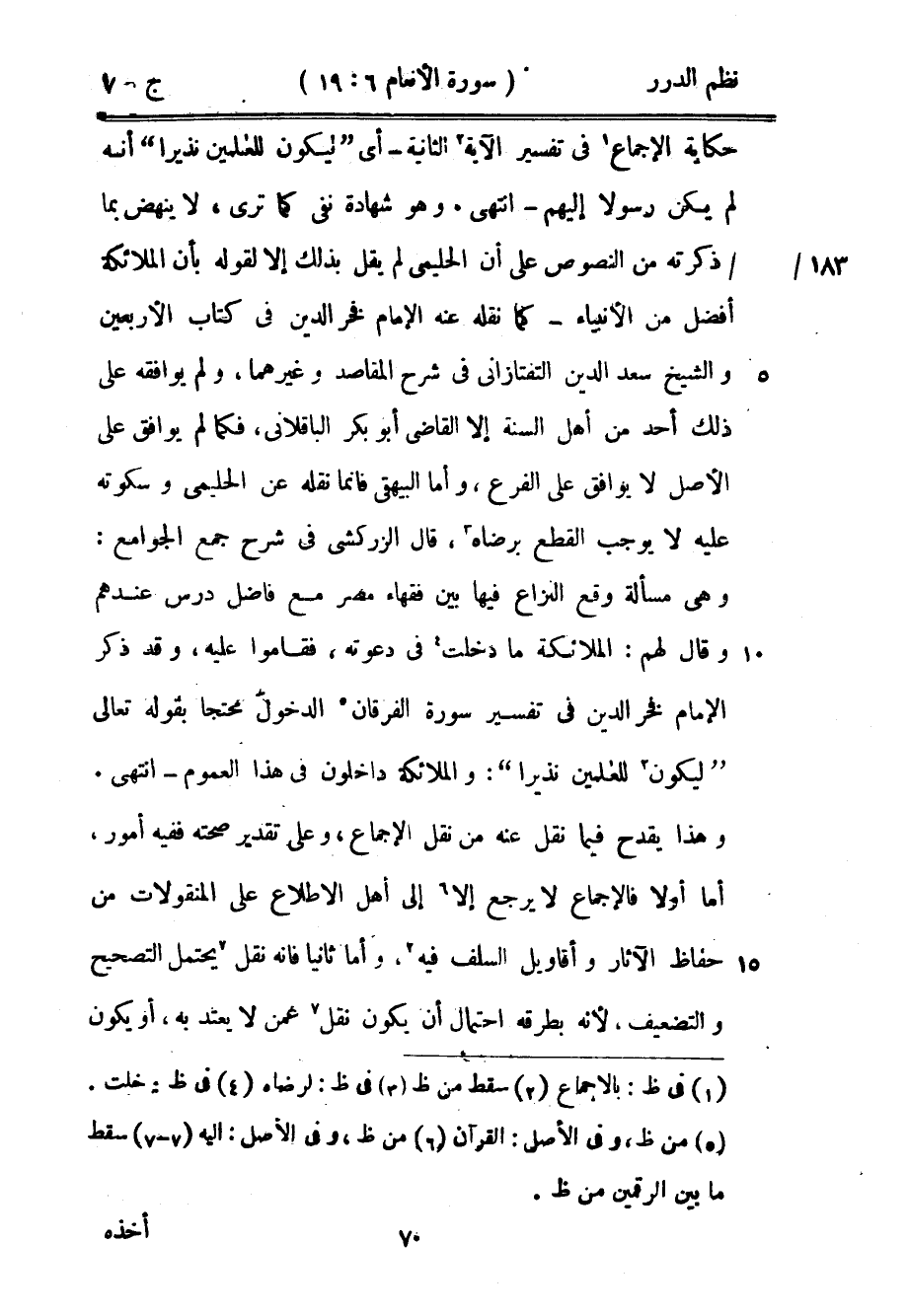 حكاية الإجماع في تفسير الآية الثانية - أي {ليكون للعالمين نذيراً} [الفرقان: 1] أنه لم يكن رسولاً إليهم - انتهى. وهو شهادة نفي كما ترى، لا ينهض بما ذكرته من النصوص على أن الحليمي لم يقل بذلك إلا لقوله بأن لملائكة أفضل من الأنبياء - كما نقله عنه الإمام فخر الدين في كتاب الأربعين والشيخ سعد الدين التفتازاني في شرح المقاصد وغيرهما، ولم يوافقه على ذلك أحد من أهل السنة إلا القاضي ابو بكر الباقلاني، فكما لم يوافق على الأصل لا يوافق على الفرع، وأما البيهقي فإنما نقله عن الحليمي وسكوته عليه لا يوجب القطع برضاه، قال الزركشي في شرح جمع الجوامع: وهي مسألة وقع النزاع فيها بين فقهاء مصر مع فاضل درس عندهم وقال لهم: الملائكة ما دخلت في دعوته، فقاموا عليه، وقد ذكر الإمام فخر الدين في تفسير سورة الفرقان الدخول محتجاً بقوله تعالى {ليكون للعالمين نذيراً} : والملائكة داخلون في هذا العموم - انتهى.