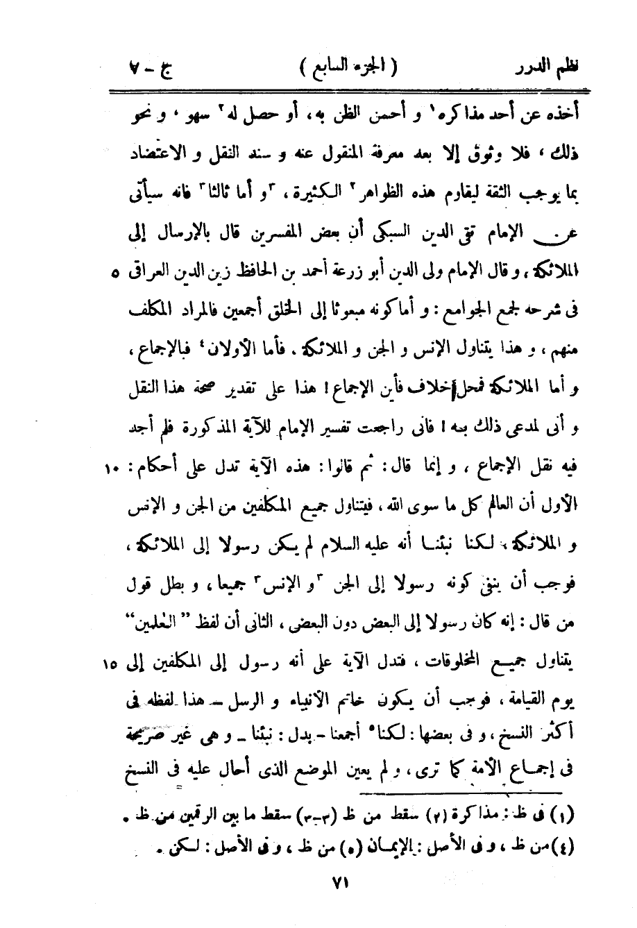 أخذه عن أحد مذاكرة وأحسن الظن به، أو حصل له سهو، ونحو ذلك، فلا وثوق إلا بعد معرفة المنقول عنه وسند النقل والاعتضاد بما يوجب الثقة ليقاوم هذه الظواهر الكثيرة، وأما ثالثاً فإنه سيأتي عن الإمام تقي الدين السبكي أن بعض المفسرين قال بالإرسال إلى الملائكة، وق الإمام ولي الدين أبو زرعة أحمد ابن الحافظ زين الدين العراقي في شرحه لجمع الجوامع: وأما كونه مبعوثاً إلى الخلق أجمعين فالمراد المكلف منهم، وهذا يتناول الإنس والجن والملائكة، فأما الأولان فبالإجماع، وأما الملائكة فمحل خلاف فأين الإجماع! هذا على تقدير صحة هذا النقل وأنى لمدعي ذلك به فإني راجعت تفسير الإمام للآية المذكورة فلم أجد فيه نقل الإجماع، وإنما قال: ثم قالوا: هذه الآية تدل على أحكام: الأول أن العالم كل ما سوى الله، فيتناول جميع المكلفين من الجن والإنس والملائكة، لكنا نبئنا أنه عليه السلام لم يكن رسولاً إلى الملائكة، فوجب أن ينفى كونه رسولاً إلى الجن والإنس جميعاً، وبطل قول من قال: إنه كان رسولاً إلى البعض دون البعض، الثاني أن لفظ {العالمين} يتناول جميع المخلوقات، فتدل الآية على أنه رسول إلى المكلفين إلى يوم القيامة، فوجب أن يكون خاتم الأنبياء والرسل - هذا لفظه في أكثر النسخ، وفي بعضها: لكنا أجمعنا - بدل: نبئنا - وهي غير صريحة في إجماع الأمة كما ترى، ولم يعين الموضع الذي أحال عليه في النسخ