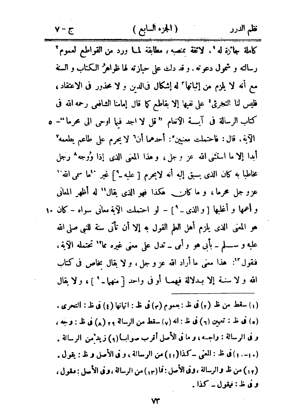 كاملة جائزة له، لائقة بمنصبه، مطابقة لما ورد من القواطع لعموم رسالته وشمول دعوته، وقد دلت على حيازته لها ظواهر الكتاب والسنة مع أنه لا يلزم من إثباتها له إشكال في الدين ولا محذور في الاعتقاد، فليس لنا التجريء على نفيها إلا بقاطع كما قال إمامنا الشافعي رحمه الله في كتاب الرسالة في آية الأنعام {قل لا أجد فيما أوحي إليّ محرماً} [الأنعام: 145] قال: فاحتملت معنيين: أحدهما أن لا يحرم على طاعم يطعمه أبداً إلا ما استثنى الله عز وجل، وهذا المعنى الذي إذا وُوجه رجل مخاطباً به كان الذي يسبق إليه أنه لا يحرم عليه غير ما سمى الله عز وجل محرماً، وما كان هكذا فهو الذي يقال له أظهر المعاني وأعمها وأغلبها والذي لو احتملت الآية معاني سواه - كان هو المعنى الذي يلزم أهل العلم القول به إلا أن تأتي سنة للنبي صَلَّى اللهُ عَلَيْهِ وَسَلَّمَ - بأبي هو وأمي - تدل على معنى غيره مما تحتمله الآية، فنقول: هذا معنى ما أراد الله عزّ وجلّ، ولا يقال بخاص في كتاب الله ولا سنة إلا بدلالة فيهما أو في واحد منهما، ولا يقال
