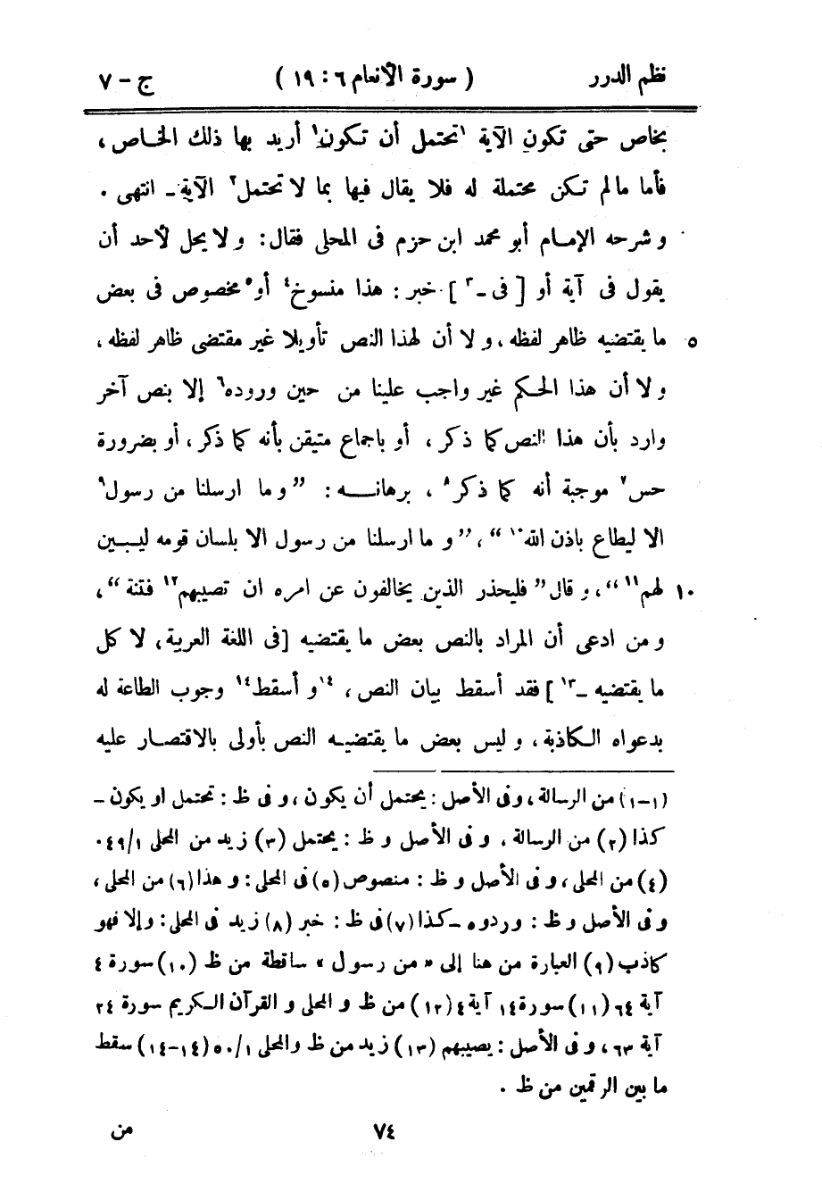 بخاص حتى تكون الآية تحتمل أن تكون أريد بها ذلك الخاص، فأما ما لم تكن محتملة له فلا يقال فيها بما لا تحتمل الآية - انتهى. وشرحه الإمام أبو محمد بن حزم في المحلى فقال: ولا يحل لأحد أن يقول في آية أو في خبر: هذا منسوخ أو مخصوص في بعض ما يقتضيه ظاهر لفظه، ولا أن لهذا النص تأويلاً غير مقتضى ظاهر لفظه، ولا أن هذا الحكم غير واجب علينا من حين وروده إلا بنص آخر وارد بأن هذا النص كما ذكر، أو بإجماع متيقن بأنه كما ذكر، أو بضرورة حس موجبة أنه كما ذكر، برهانه: