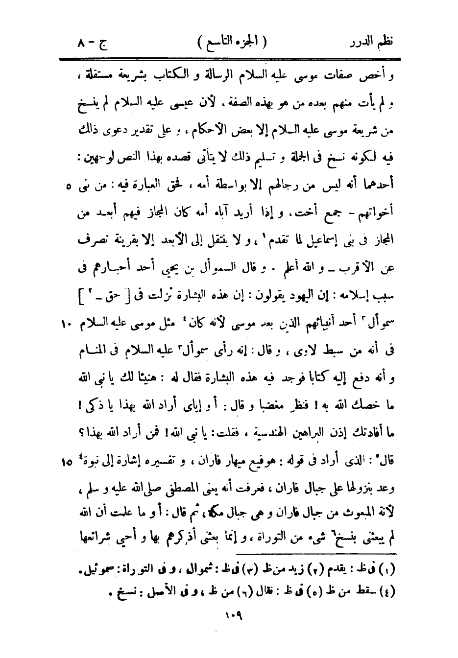 وأخص صفات موسى عليه السلام الرسالة والكتاب بشريعة مستقلة، ولم يأت منهم بعده من هو بهذه الصفة، لأن عيسى عليه السلام لم ينسخ من شريعة موسى عليه السلام إلا بعض الأحكام، وعلى تقدير دعوى ذلك فيه لكونه نسخ في الجملة وتسليم ذلك لا يتأتى قصده بهذا النص لوجهين: أحدهما أنه ليس من رجالهم إلا بواسطة أمه، فحق العبارة فيه: من بني أخواتهم - جمع أخت، وإذا أريد آباء أمه كان المجاز فيهم أبعد من المجاز في بني إسماعيل لما تقدم، ولا ينتقل إلى الأبعد إلا بقرينة تصرف عن الأقرب - والله أعلم. وقال السمؤال بن يحيى أحد أحبارهم في سبب إسلامه: إن اليهود يقولون: إن هذه البشارة نزلت في حق سموأل أحد أنبيائهم الذين بعد موسى لأنه كان مثل موسى عليه السلام في أنه من سبط لاوي، وقال: إنه رأى سموأل عليه السلام في المنام وأنه دفع إليه كتاباً فوجد فيه هذه البشارة فقال له: هنيئاً لك يا نبي الله ما خصك الله به! فنظر مغضباً وقال: أوإياي أراد الله بهذا يا ذكي! ما أفادتك إذن البراهين الهندسية، فقلت: يا نبي الله! فمن أراد الله بهذا؟ قال: الذي أراد في قوله: هوفيع ميهار فاران، وتفسيره إشارة إلى نبوة وعد بنزولها على جبال فاران، فعرفت أنه يعني المصطفى صَلَّى اللهُ عَلَيْهِ وَسَلَّمَ، لأنه المبعوث من جبال فاران وهي جبال مكة، ثم قال: أو ما علمت ان الله لم يبعثني بنسخ شيء من التوارة، وإنما بعثني أذكرهم بها وأحيي شرائعها