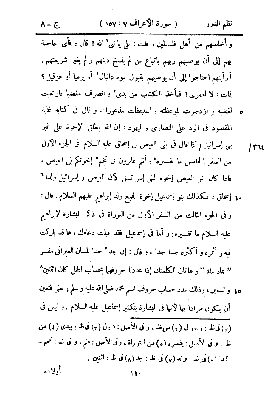 وأخلصهم من أهل فلسطين، قلت: بلى يانبي الله! قال: فأي حاجة بهم إلى أن يوصيهم ربهم باتباع من لم ينسخ دينهم ولم يغير شريعتهم، أرأيتهم احتاجوا إلى أن يوصيهم بقبول نبوة دانيال أو يرميا أو حزقيل؟ قلت: لا لعمري! فأخذ الكتاب من يدي وانصرف مغضباً فارتعبت لغضبه وازدجرت لموعظته واستيقظت مذعوراً. وقال في كتابه غاية المقصود في الرد على النصارى واليهود: إن الله يطلق الإخوة على غير بني إسرائيل كما قال في بني العيص بن إسحاق عليه السلام في الجزء الأول من السفر الخامس ما تفسيره: أنتم عابرون في تخم إخوتكم بني العيص فإذا كانوا بنو العيص إخوة لبني إسرائيل لأن العيص وإسرائيل ولدا إسحاق، فكذلك بنو إسماعيل إخوة لجميع ولد إبراهيم عليهم السلام، قال: وفي الجزء الثالث من السفر الأول من التوراة في ذكر البشارة لإبراهيم عليه السلام ما تفسيره: وأما في إسماعيل فقد قبلت دعاءك، ها قد باركت فيه وأثمره وأكثره جداً جداً وقال: إن جداً جداً بلسان العبراني مفسر «بماد ماد» وهاتان الكلمتان إذا عددنا حروفها بحساب الجمل كان اثنتين وتسعين، وذلك عدد حساب حروف اسم محمد صَلَّى اللهُ عَلَيْهِ وَسَلَّمَ، يعني فتعين أن يكون مراداً بها لأنها في البشارة بتكثير إسماعيل عليه السلام، وليس في