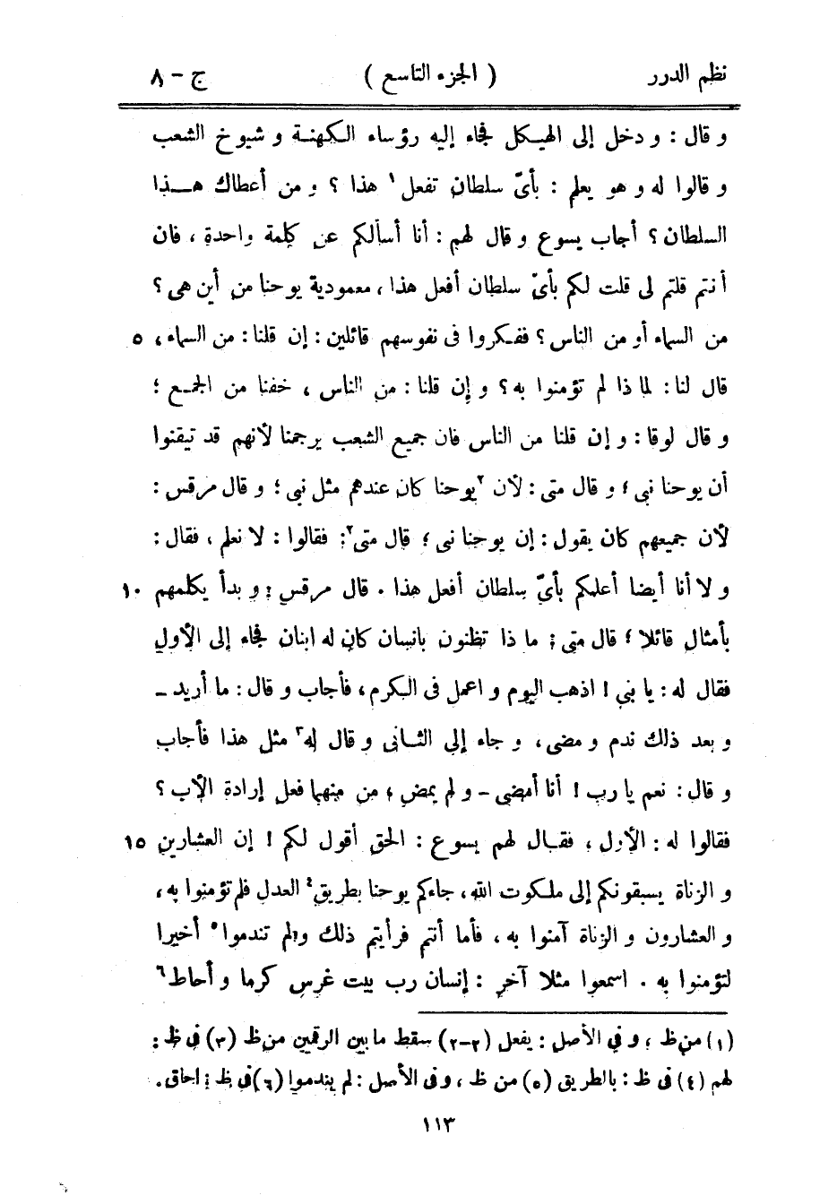 وقال: ودخل إلى الهيكل فجاء إليه رؤساء النكهة وشيوخ الشعب وقالوا له وهو يعلم: بأيّ سلطان تفعل هذا؟ ومن اعطاك هذا السلطان؟ أجاب يسوع وقال لهم: أنا أسألكم عن كلمة واحدة، فإن أنتم قلتم لي قلت لكم بأي سلطان أفعل هذا، معمودية يوحنا من أين هي؟ من السماء أو من الناس؟ ففكروا في نفوسهم قائلين: إن قلنا: من السماء قال لنا: لماذا لم تؤمنوا به؟ وإن قلنا: من الناس، خفنا من الجمع، وقال لوقا: وإن قلنا من الناس فإن جميع الشعب يرجمنا لأنهم قد تيقنوا أن يوحنا نبي؛ وقال متى: لأن يوحنا كان عندهم مثل نبي؛ وقال مرقس: لأن جميعهم كان يقول: إن يوحنا نبي؛ قال متى: فقالوا: لا نعلم، فقال: ولا أنا أيضاً أعلمكم بأي سلطان أفعل هذا.