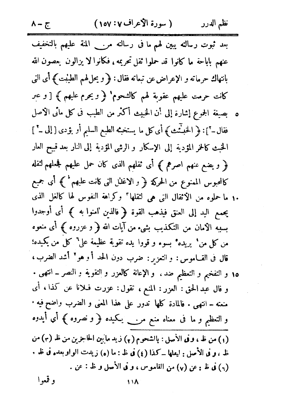 بعد ثبوت رسالته يبين لهم ما في رسالته من المنة عليهم بالتخفيف عنهم بإباحة ما كانوا قد حملوا ثقل تحريمه، فكانوا لا يزالون يعصون الله بانتهاك حرماته والإعراض عن تبعاته فقال: {ويحل لهم الطيبات} أي التي كانت حرمت عليهم عقوبة لهم كالشحوم {ويحرم عليهم} وعبر بصيغة الجموع إشارة إلى أن الخبيث أكثر من الطيب في كل مائي الأصل فقال: {الخبائث} أي كل ما يستخبثه الطبع السليم أو يؤدي إلى الخبث كالخمر المؤدية إلى الإسكار والرشى المؤدية إلى النار بعد قبيح العار {ويضع عنهم إصرهم} أي ثقلهم الذي كان حمل عليهم فجعلهم لثقلة كالمحبوس الممنوع من الحركة {والأغلال التي كانت عليهم} أي جميع ما حملوه من الأثقال التي هي لثقلها وكراهة النفوس لها كالغل الذي يجمع اليد إلى العنق فيذهب القوة {فالذين آمنوا به} أي أوجدوا بسببه الأمان من التكذيب بشيء من آيات الله {وعزروه} أي منعوه من كل من يريده بسوء وقووا يده تقوية عظيمة على كل من يكيده: قال في القاموس: والتعزير: ضرب دون الحد أو هو أشد الضرب، والتفخيم والتعظيم ضد، والإعانة كالعزر والتقوية والنصر- انتهى.