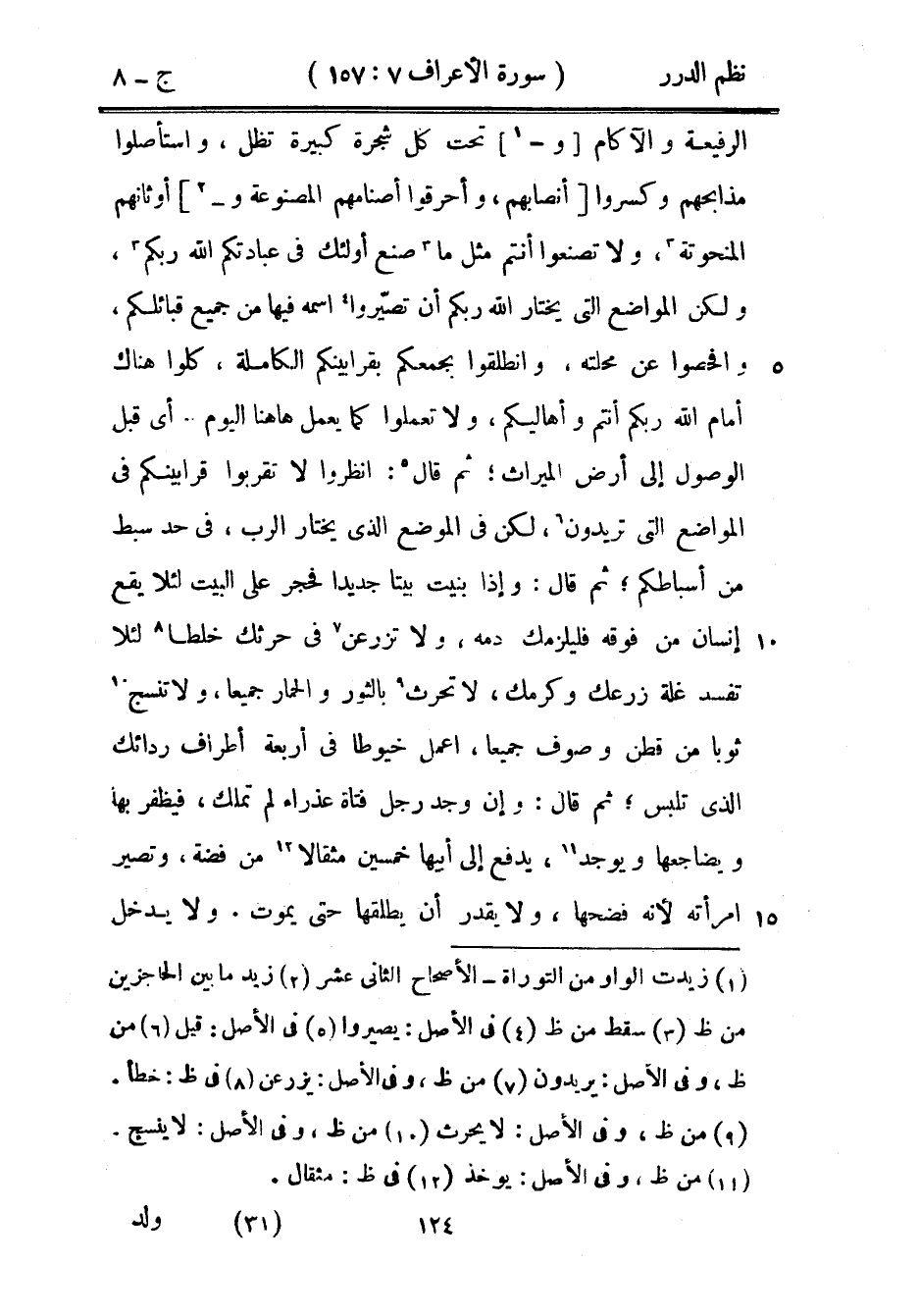 الرفيعة والآكام وتحت كل شجرة كبيرة تظل، واستأصلوا مذابحهم وكسروا أنصابهم، وأحرقوا أصنامهم المصنوعة وأوثانهم المنحوته، ولا تصنعوا أنتم مثل ما صنع أولئك في عبادتكم الله ربكم، ولكن المواضع التي يختار الله ربكم أن تصيِّروا اسمه فيها من جميع قبائلكم، وافحصوا عن محلته، وانطلقوا بجمعكم بقرابينكم الكاملة، كلوا هناك أمام الله ربكم أنتم وأهاليكم، ولا تعملوا كما يعمل هاهنا اليوم أي قبل الوصول إلى أرض الميراث؛ ثم قال: انظروا لا تقربوا قرابينكم في المواضع التي تريدون، لكن في المواضع الذي يختار الرب، في حد سبط من أسباطكم؛ ثم قال: وإذا بنيت بيتاً جديداً فحجر على البيت لئلا يقع إنسان من فوقه فليلزمك دمه، ولا تزرعن في حرثك خلطاً لئلا تفسد غلة زرعك وكرمك، لا تحرث بالثور والحمار جميعاً، ولا تنسج ثوباً من قطن وصوف جميعاً، اعمل خيوطاً في أربعة أطراف ردائك الذي تلبس؛ ثم قال: وإن وجد رجل فتاة عذراء لم تملك، فيظفر بها ويضاجعها ويوجد، يدفع إلى أبيها خمسين مثقالاً من فضة، وتصير امرأته لأنه فضحها، ولا يقدر أن يطلقها حتى يموت.