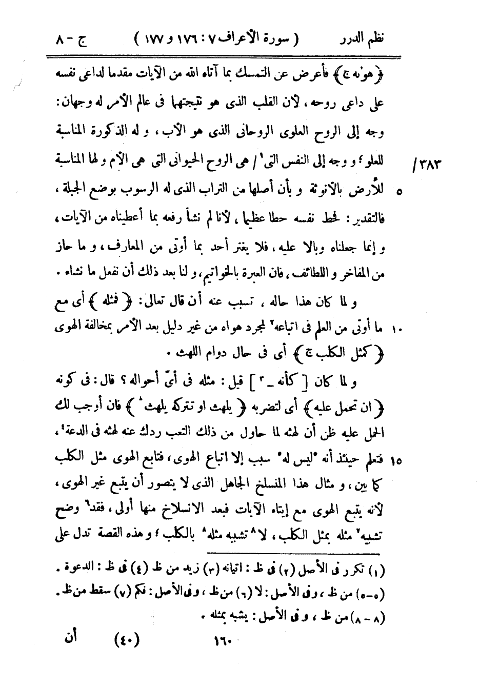 {هواه} فأعرض عن التمسك بما آتاه الله من الآيات مقدماً لداعي نفسه على داعي روحه، لأن القلب الذي هو نتيجتهما في عالم الأمر له وجهان: وجه إلى الروح العلوي الروحاني الذي هو الأب، وله الذكورة المناسبة للعلو؛ ووجه إلى النفس التي هي الروح الحيواني التي هي الأم ولها المناسبة للأرض بالأنوثة وبأن أصلها من التراب الذي له الرسوب بوضع الجبلة فالتقدير: فحط نفسه حطّاً عظيماً، لأنا لم نشأ رفعه بما أعطيناه من الآيات، وإنما جعلناه وبالاً عليه، فلا يغتر أحد بما أوتي من المعارف، وما حاز من المفاخر واللطائف، فإن العبرة بالخواتيم، ولنا بعد ذلك أن نفعل ما نشاء.