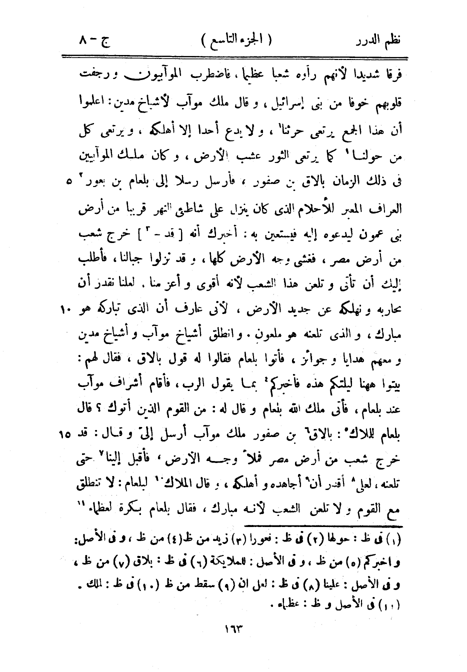 فرقاً شديداً لأنهم رأوه شعباً عظيماً، فاضطرب المؤابيون ورجفت قلوبهم خوفاً من بني إسرائيل، وقال ملك مؤاب لأشياخ مدين: اعلموا أن هذا الجمع يرتعي حرثنا، ولا يدع أحداً إلا أهلكه، ويرتعي كل من حولنا كما يرتعي الثور عشب الأرض، وكان ملك المؤابيين في ذلك الزمان بالاق بن صفور، فأرسل رسلاً إلى بلعام بن بعور العراف المعبر للأحلام الذي كان ينزل على شاطىء النهر قريباً من أرض بني عمون ليدعوه إليه فيستعين به: أخبرك أنه قد خرج شعب من أرض مصر، فغشى وجه الأرض كلها، وقد نزلوا جبالنا، فأطلب إليك أن تأتي وتلعن هذا الشعب لأنه أقوى وأعز منا، لعلنا نقدر أن نحاربه ونهلكه عن جديد الأرض، لأني عارف أن الذي تباركه هو مبارك، والذي تلعنه هو ملعون، وانطلق أشياخ مؤاب وأشياخ مدين ومعهم هدايا وجوائز، فأتوا بلعام فقالوا له قول بالاق، فقال لهم: بيتوا هاهنا ليلتكم هذه فأخبركم بما يقول الرب، فأقام أشراف مؤاب عند بلعام، فأتى ملك الله بلعام وقال له: من القوم الذين أتوك؟ قال بلعام للملاك: بالاق بن صفور ملك مؤاب أرسل إلي وقال: قد خرج شعب من أرض مصر فملأ وجه الأرض، فأقبل إلينا حتى تلعنه، لعلي أقدر أن أجاهده وأهلكه، وقال الملاك لبلعام: لا تنطلق مع القوم ولا تلعن الشعب لأنه مبارك، فقال بلعام بكرة لعظماء
