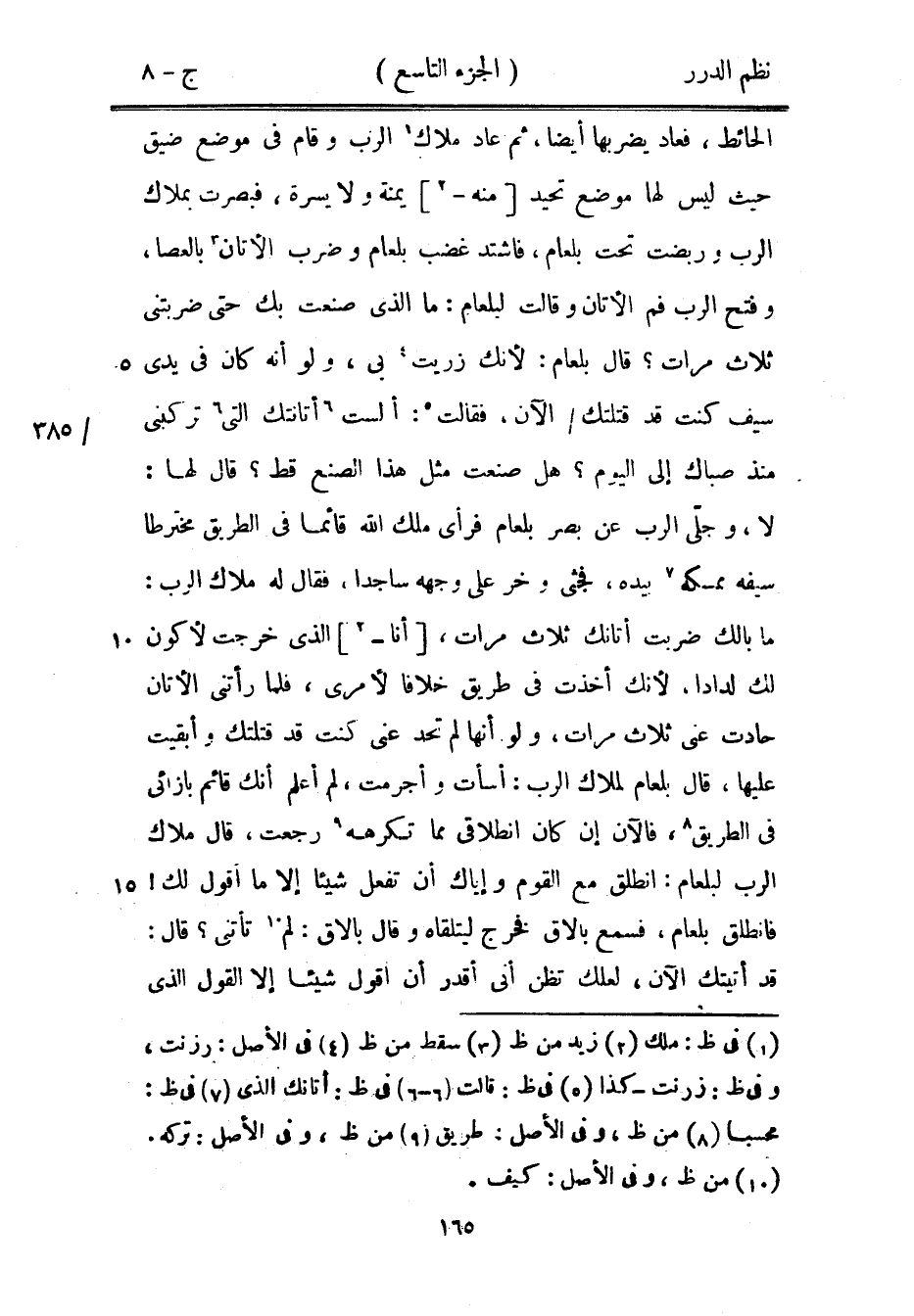الحائط، فعاد يضربها أيضاً، ثم عاد ملاك الرب وقام في موضع ضيق حيث ليس لها موضع تحيد منه يمنة ولا يسره، فبصرت بملاك الرب وربضت تحت بلعام، فاشتد غضب بلعام وضرب الأتان بالعصا، وفتح الرب فم الأتان وقالت لبلعام: ما الذي صنعت بك حتى ضربتني ثلاث مرات؟ قال بلعام: لأنك زريت بي، ولو أنه كان في يدي سيف كنت قد قتلتك الآن، فقالت: ألست أتانتك التي تركبني منذ صباك إلى اليوم؟ هل صنعت مثل هذا الصنع قط؟ قال لها: لا وجلّى الرب عن بصر بلعام فرأى ملك الله قائماً في الطريق مخترطاً سيفه ممسكه بيده، فجثا وخر على وجهه ساجداً، فقال له ملاك الرب: ما بالك ضربت أتانك ثلاث مرات أنا الذي خرجت لأكون لك لداداً، لأنك أخذت في طريق خلافاً لأمري، فلما رأتني الأتان حادت عني ثلاث مرات، ولو أنها لم تحد عني كنت قتلتك وأبقيت عليها، قال بلعام لملاك الرب: أسأت وأجرمت، لم أعلم أنك قائم بإزائي في الطريق، فالآن إن كان انطلاقي مما تكرهه رجعت، قال ملاك الرب لبلعام: انطلق مع القوم وإياك أن تفعل شيئاً إلا ما أقول لك! فانطلق بلعام، فسمع بالاق فخرج ليتلقاه وقال بالاق: لم تأتني؟ قال: قد أتيتك الآن، لعلك تظن أني أقدر أن أقول شيئاً إلا القول الذي